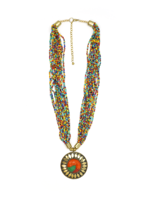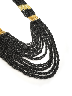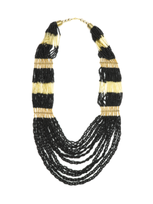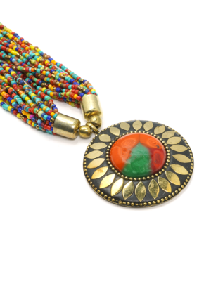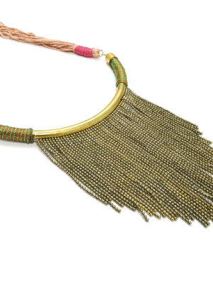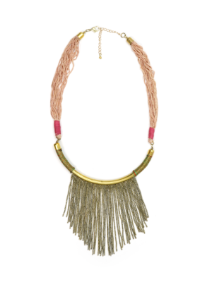 Collar de hierro dorado con pedrería de borlas en colores terracota y blanco.