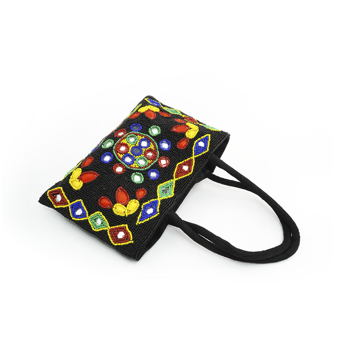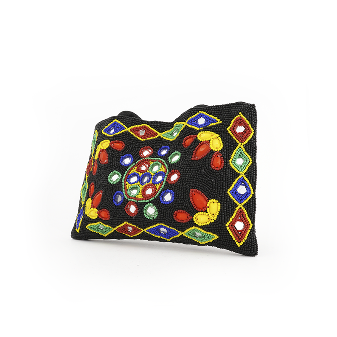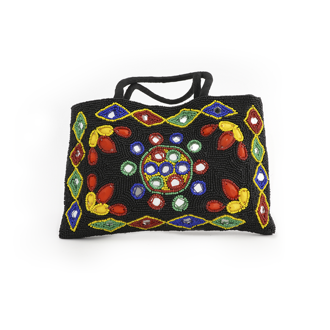 Fabric shoulder bag with beads in different colors.