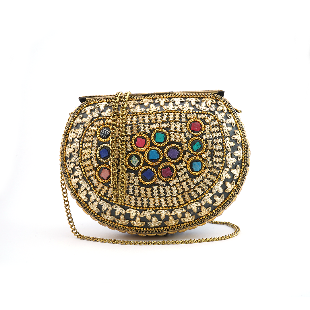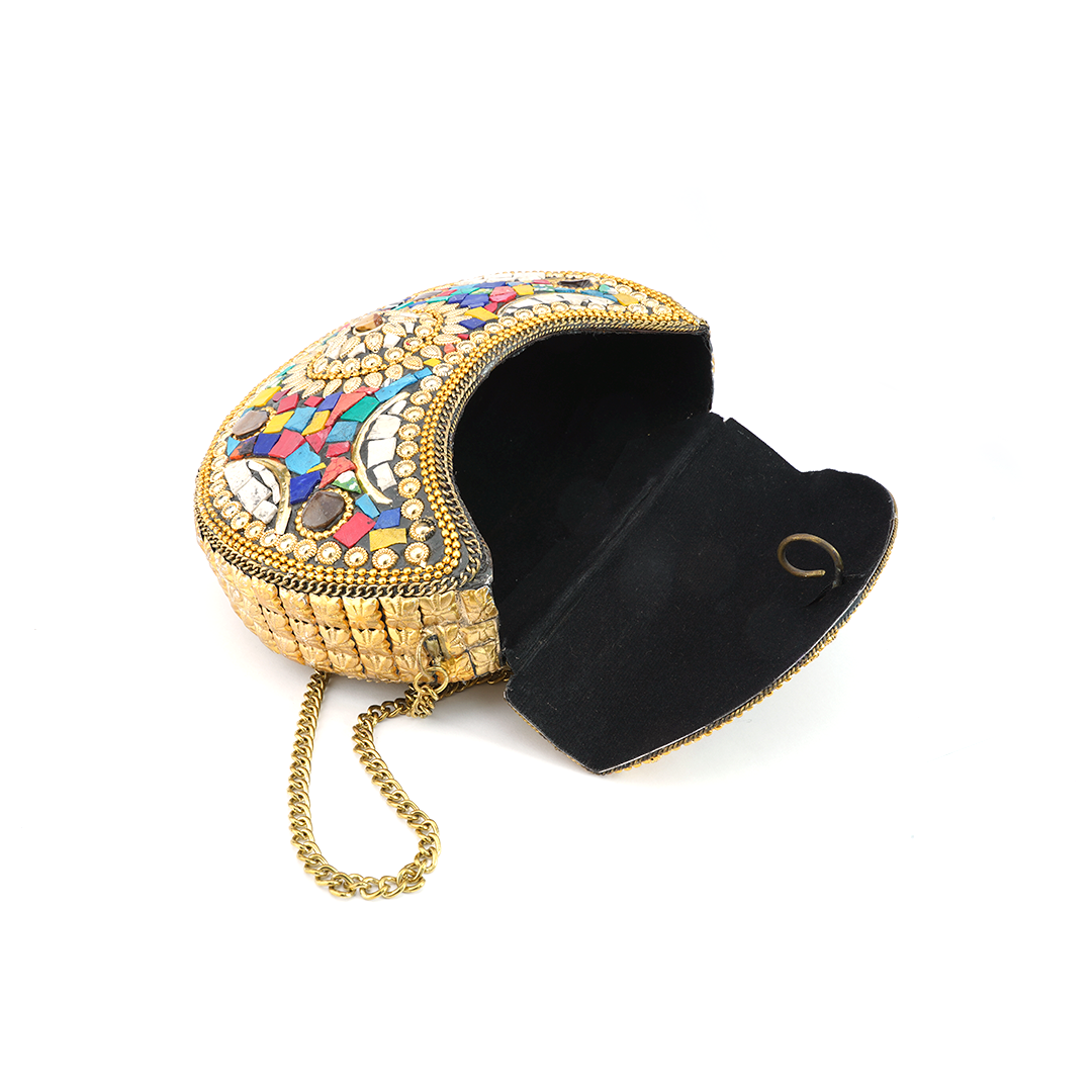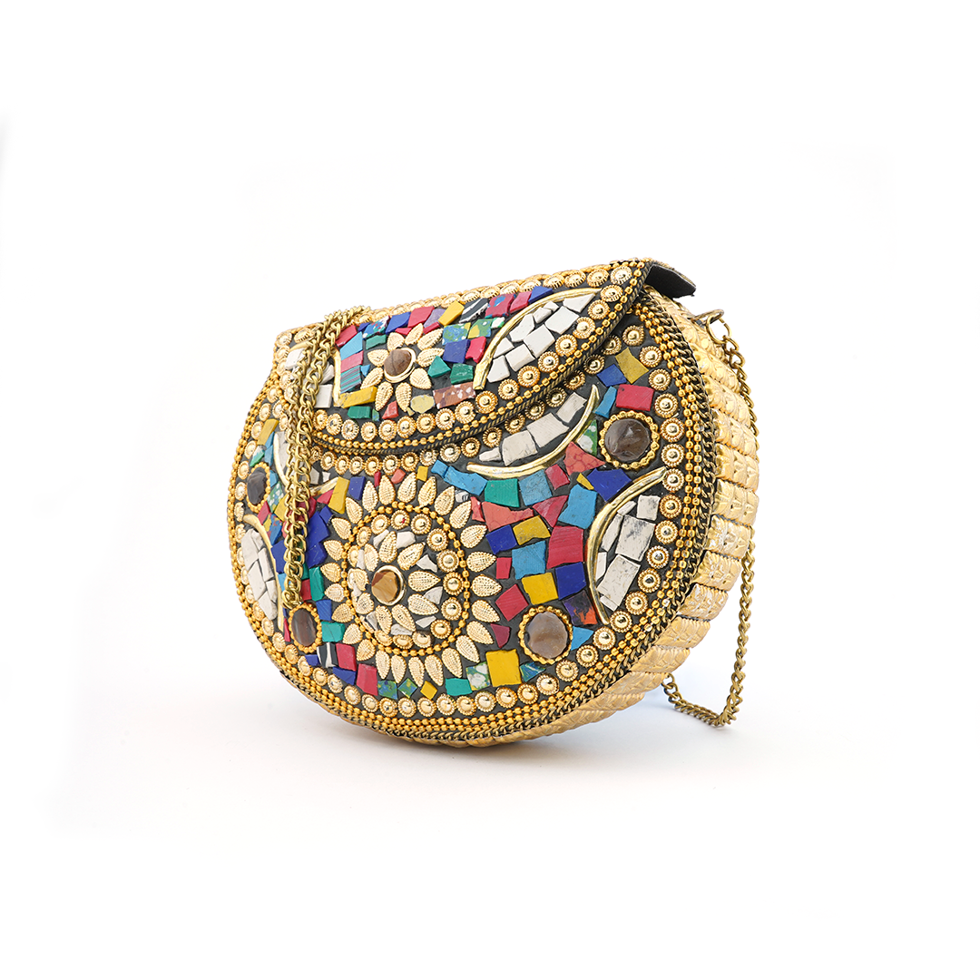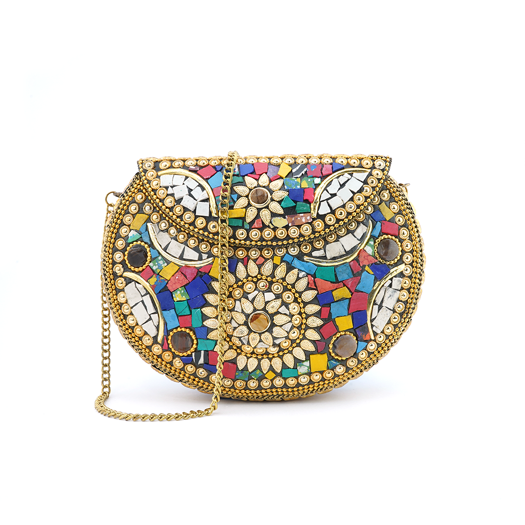 Bolso de hierro al hombro con pedrería de resina multicolor estilo mosaico.