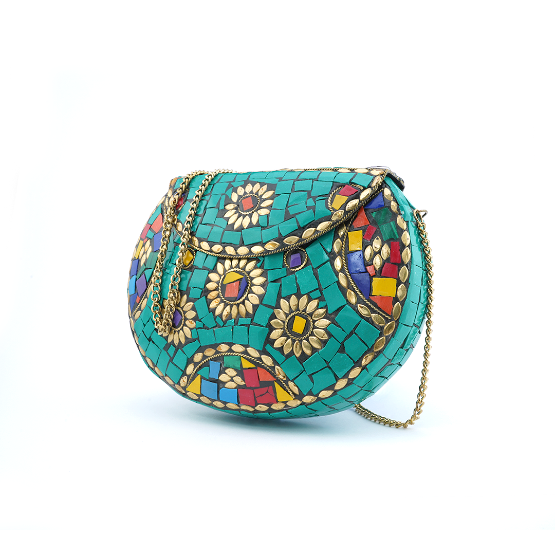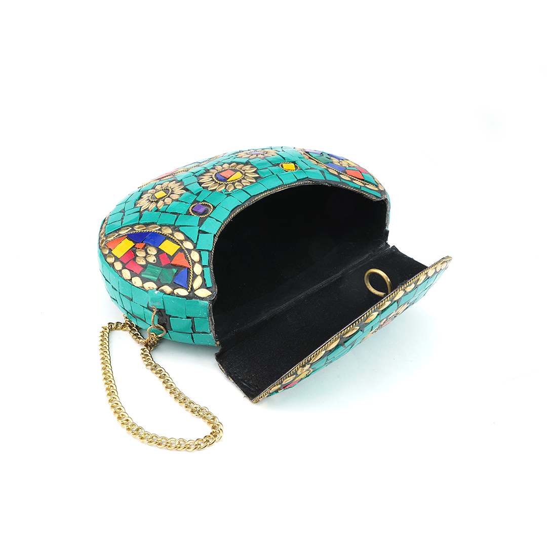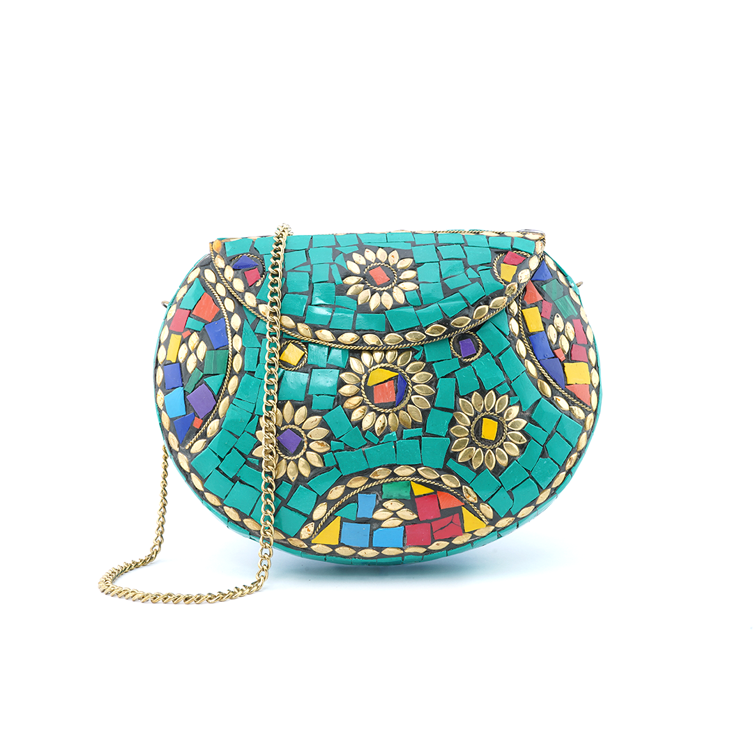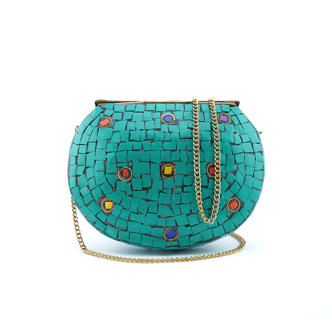 Bolso de hierro al hombro con pedrería de resina multicolor estilo mosaico.
