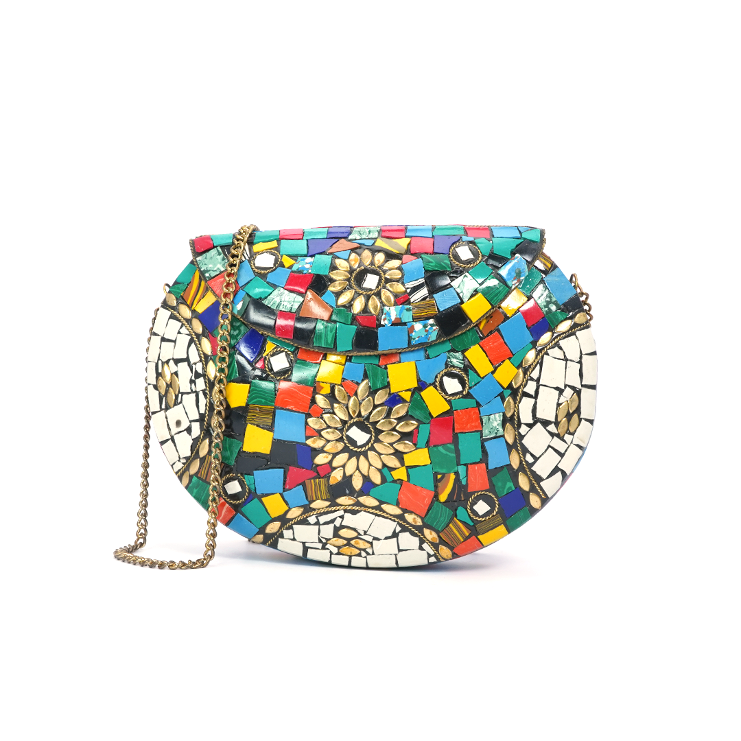 Bolso de hierro al hombro con pedrería de resina multicolor estilo mosaico.