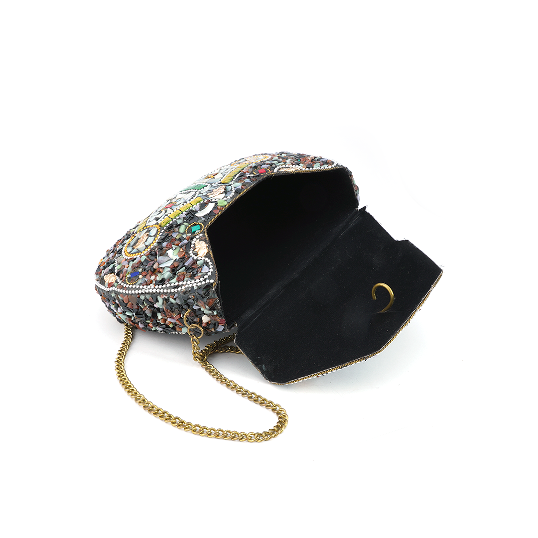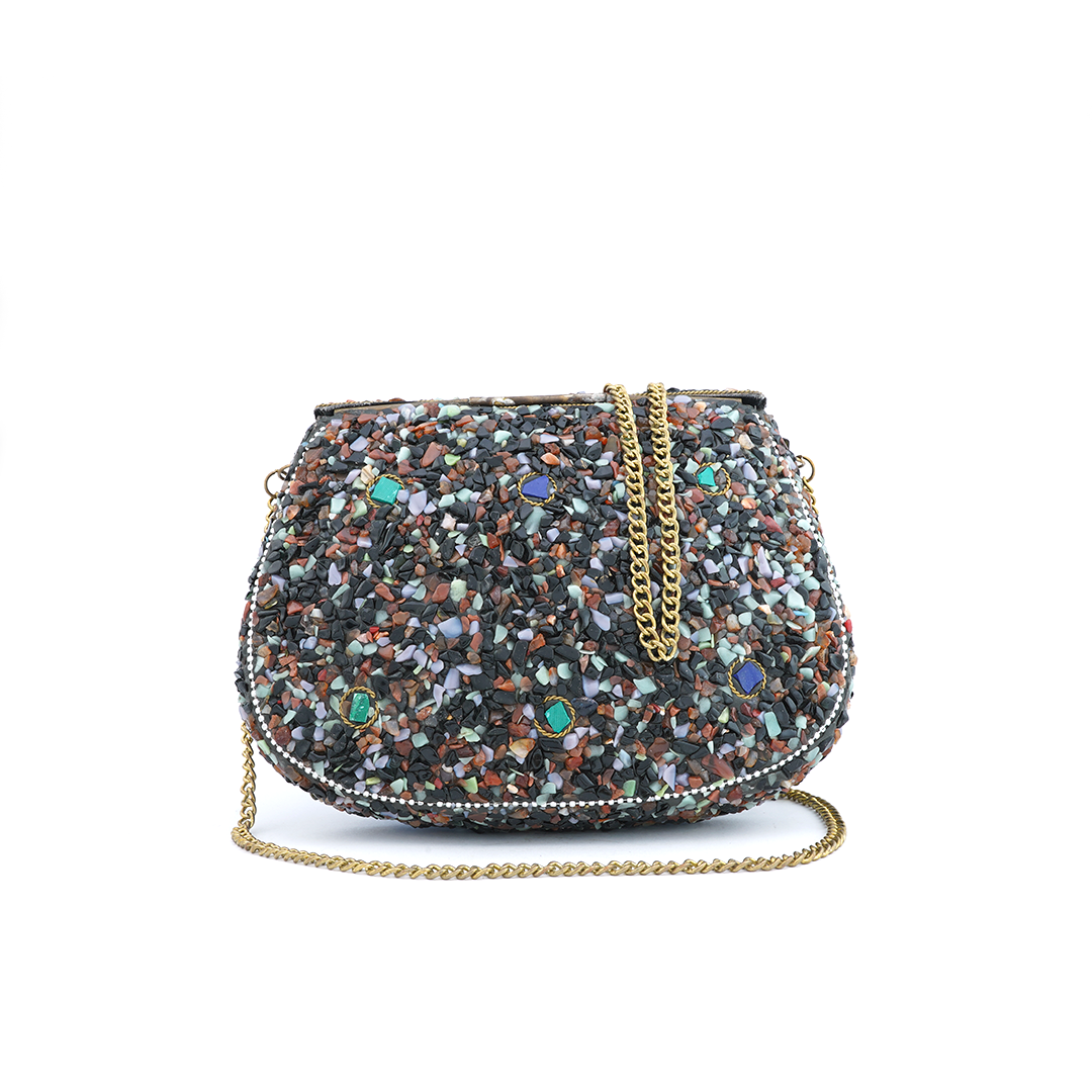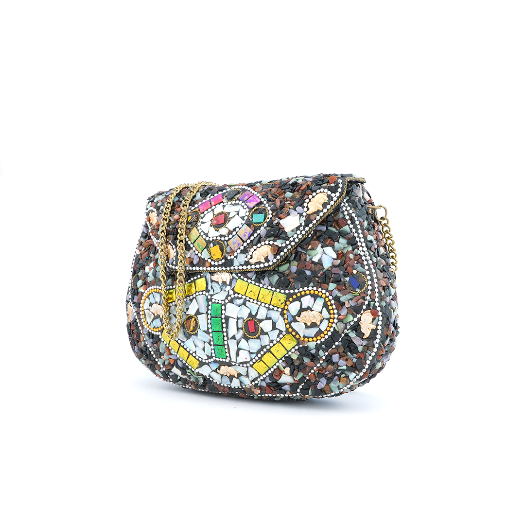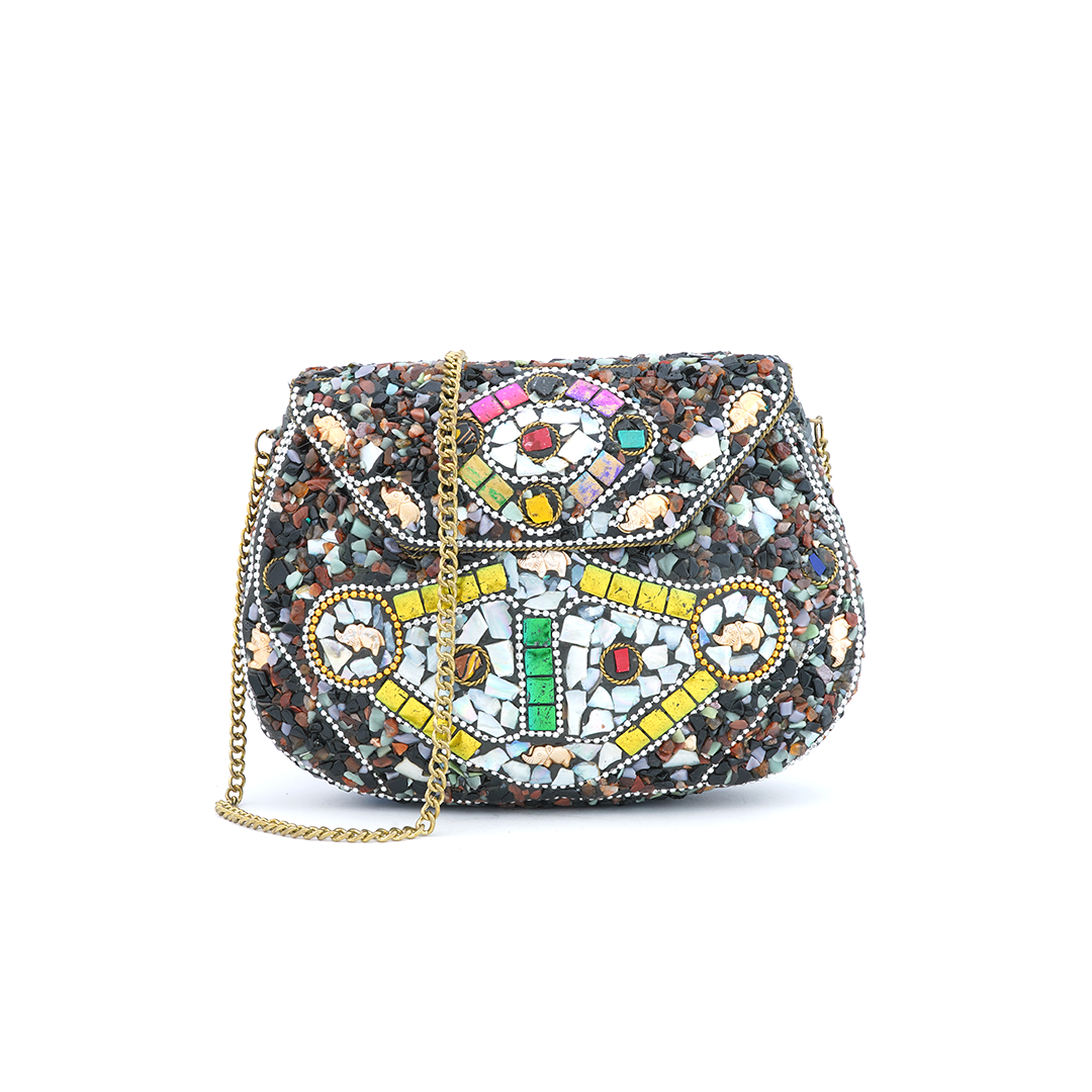 Bolso de hierro al hombro con pedrería de resina multicolor y dijes de elefante.