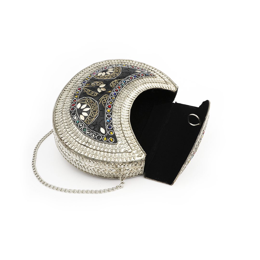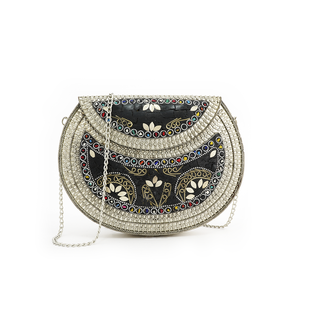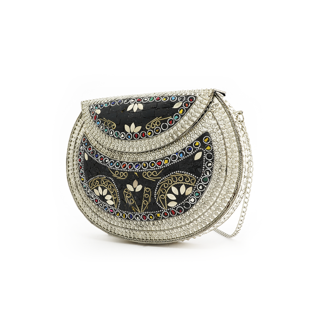 Bolso al hombro de hierro 100% color plateado hecho a mano con pedrería en color negro, rojo, verde y amarillo.