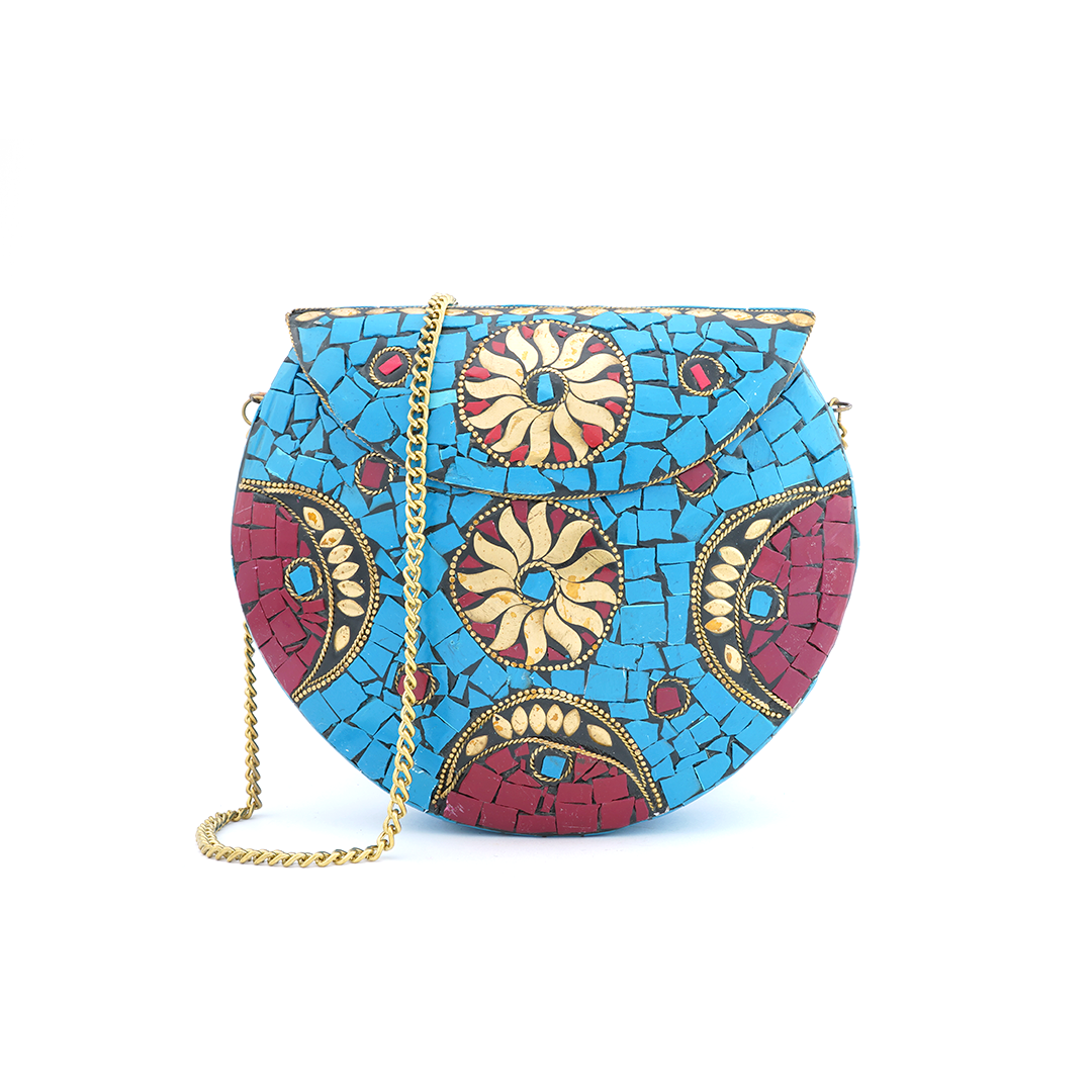 Bolso de hierro al hombro con pedrería de resina estilo mosaico y pedrería en tonos azul y rosa con detalles dorados.