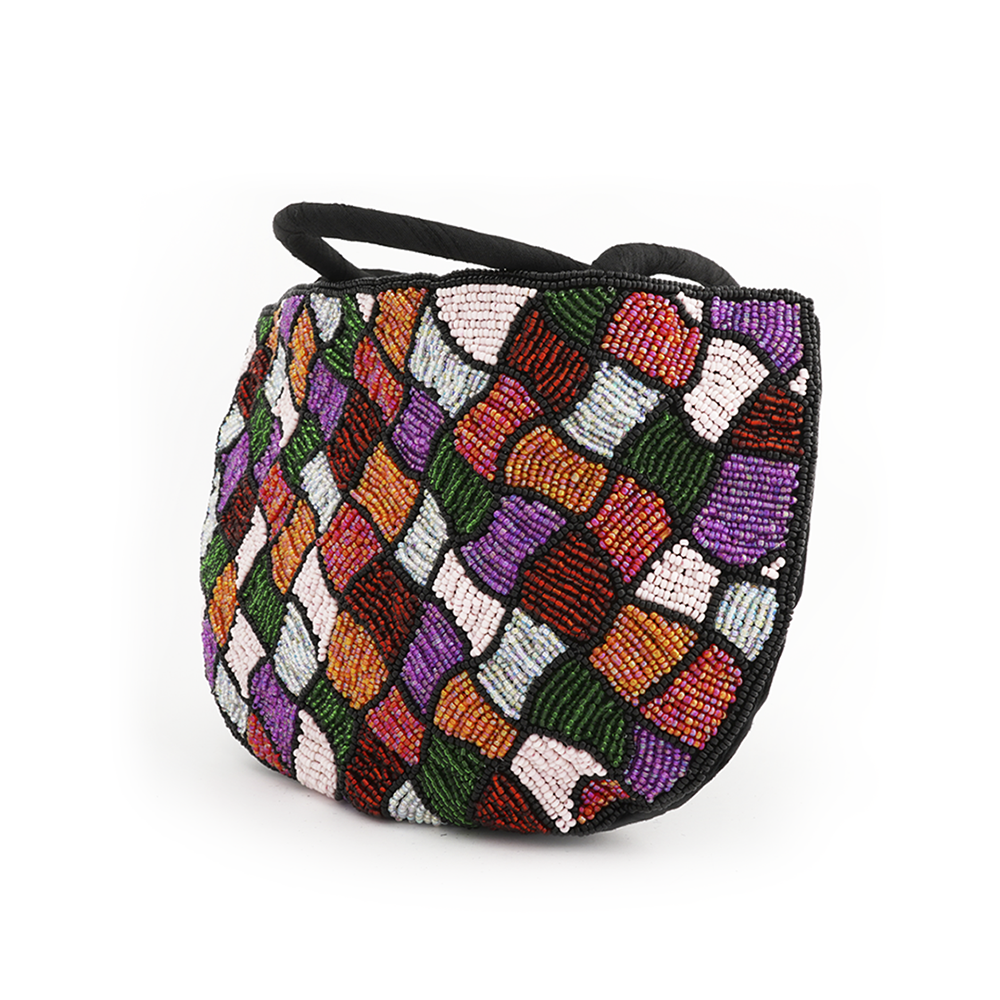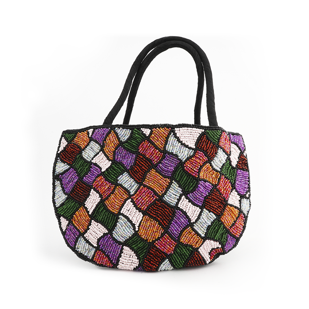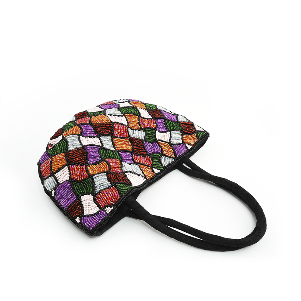 Bolso al hombro de tela con cuentitas en diversos colores.