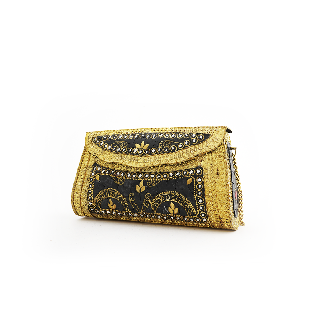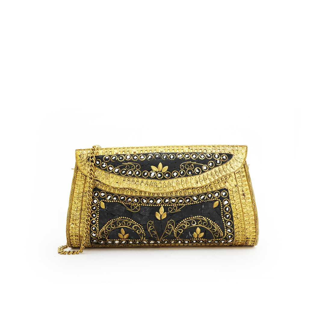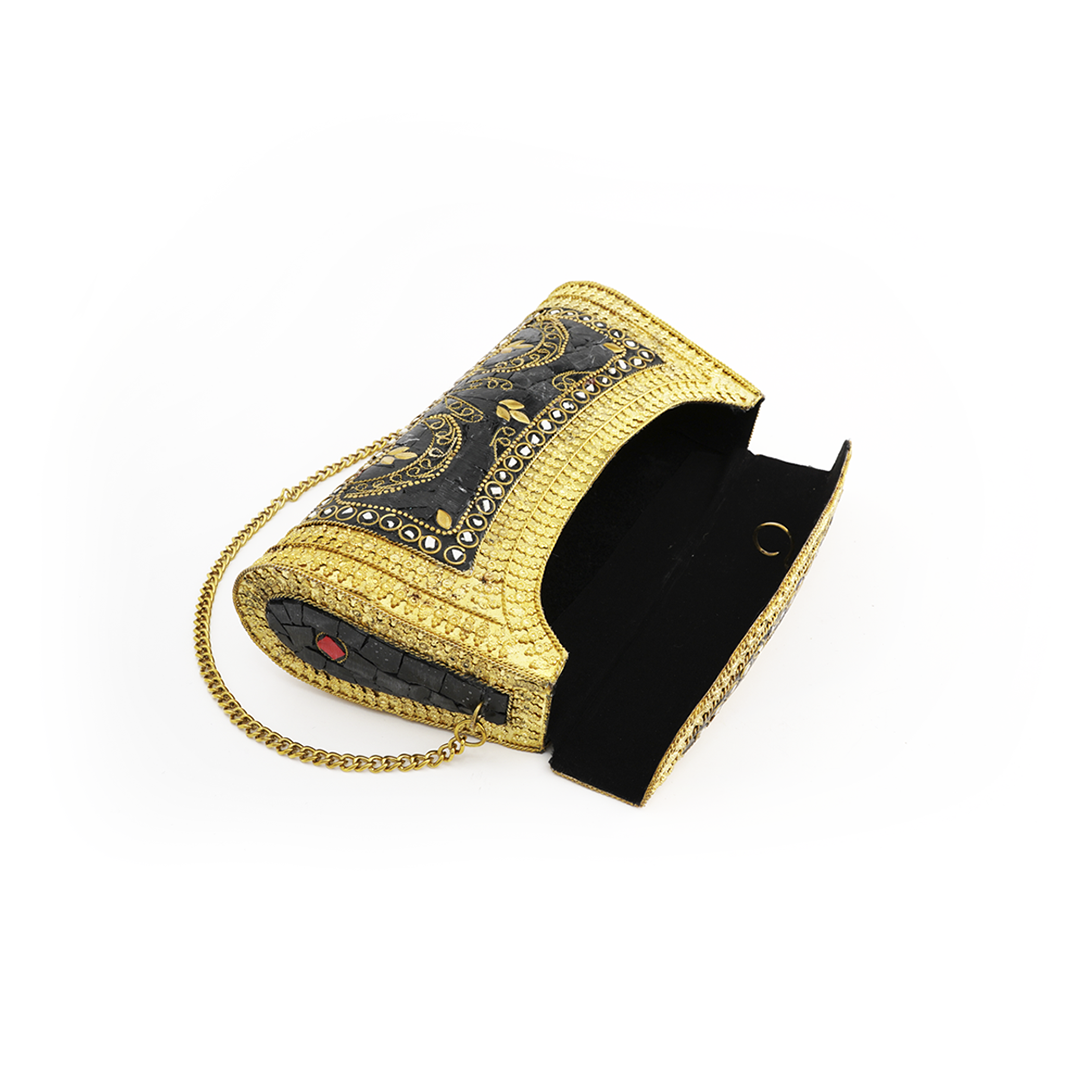Bolso de hierro cuadrado al hombro de color dorado con pedrería de resina en color negro.