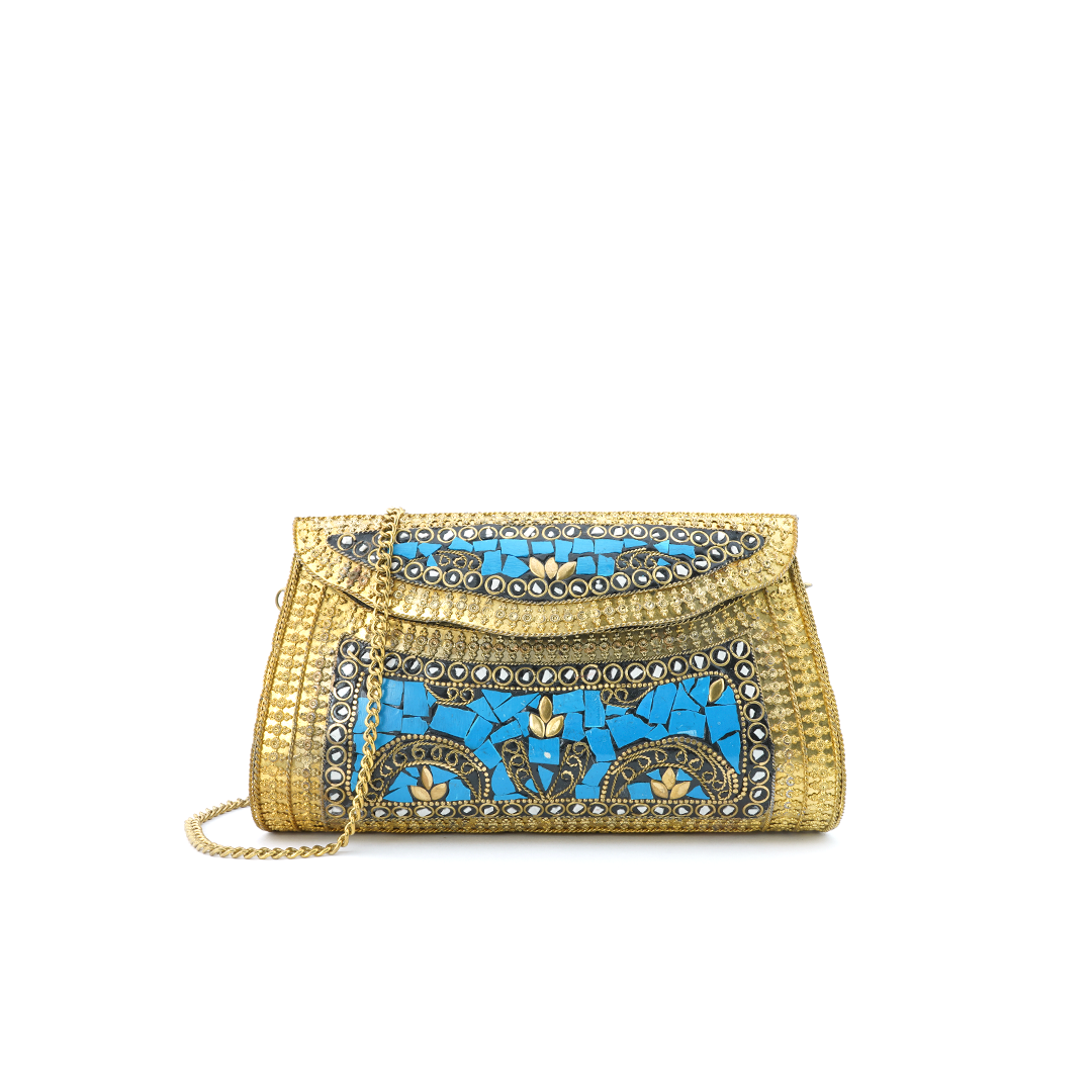 Bolso de hierro cuadrado al hombro de color dorado con pedrería de resina azul