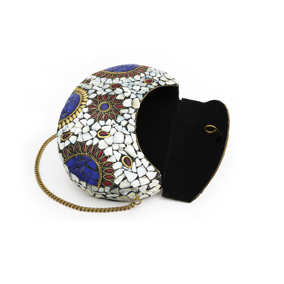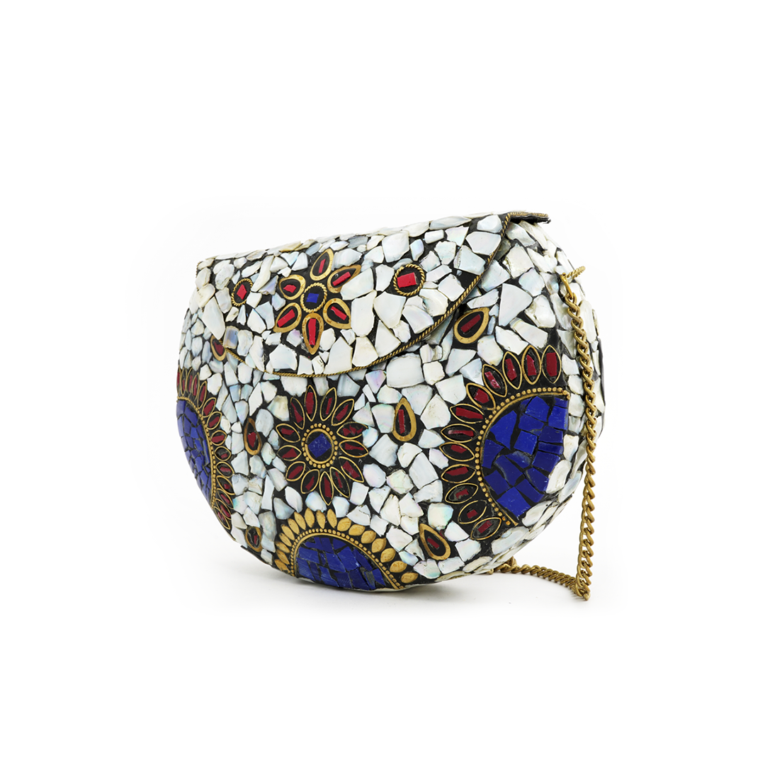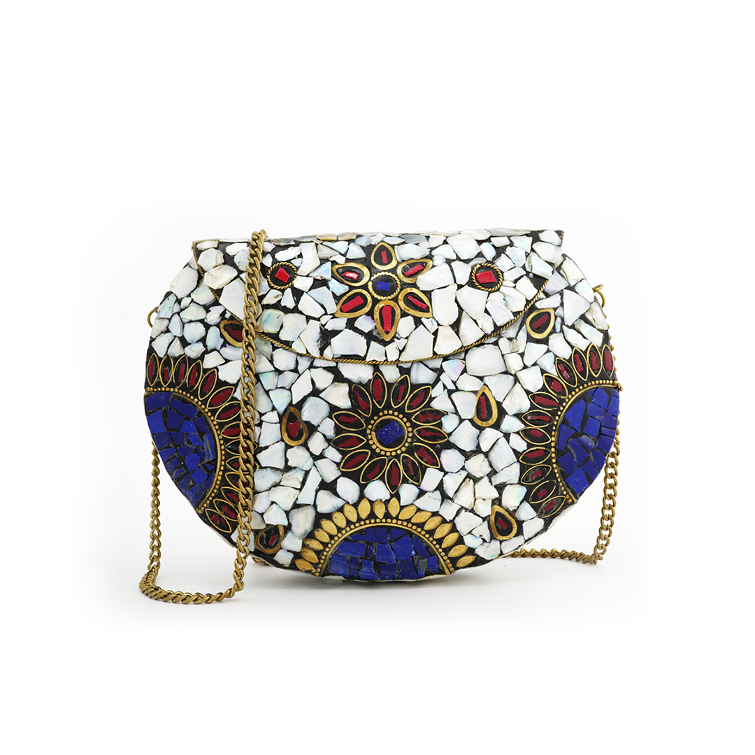 Bolso al hombro de hierro 100% color dorado, con pedrería en colores blanco, azul, terracota, verde y naranja.