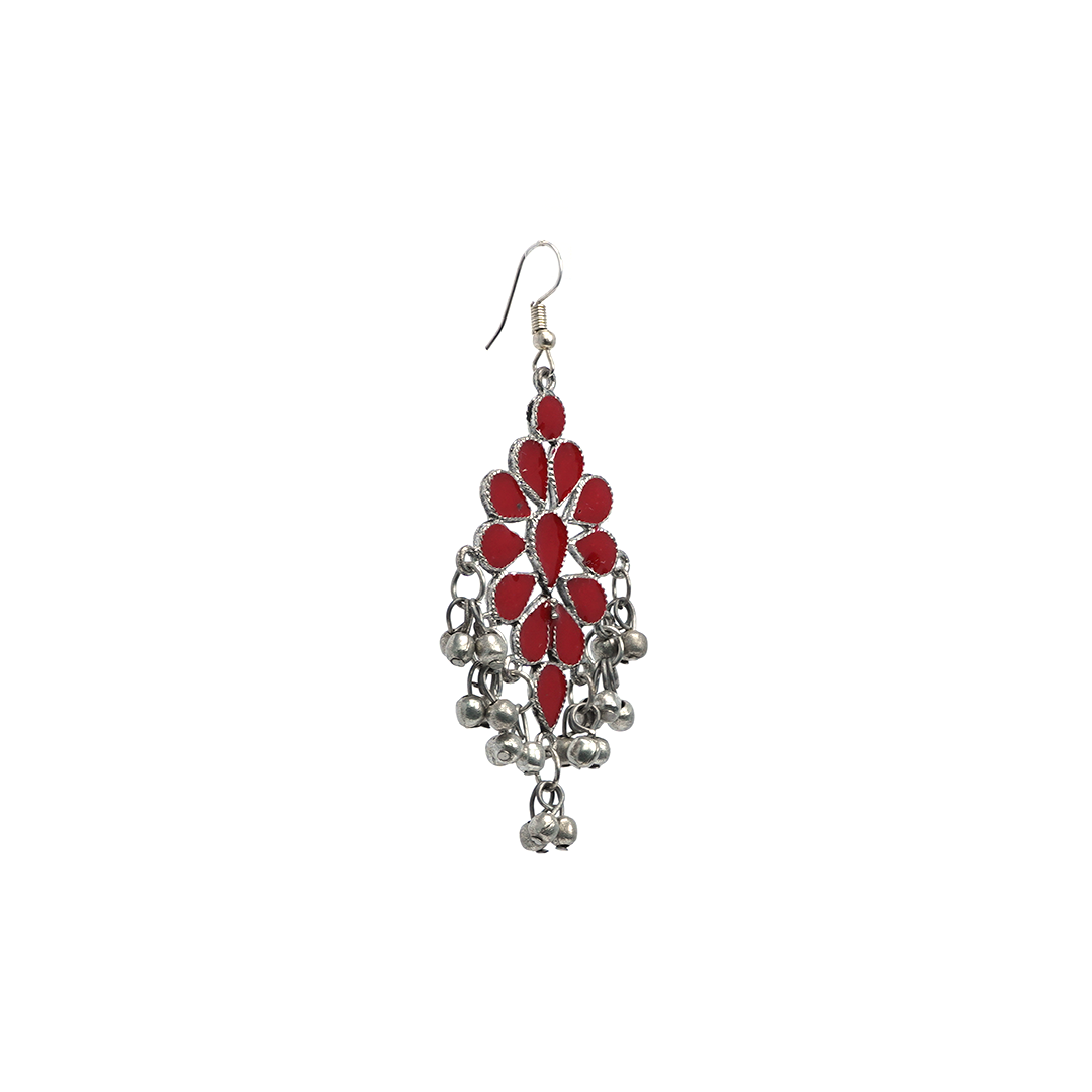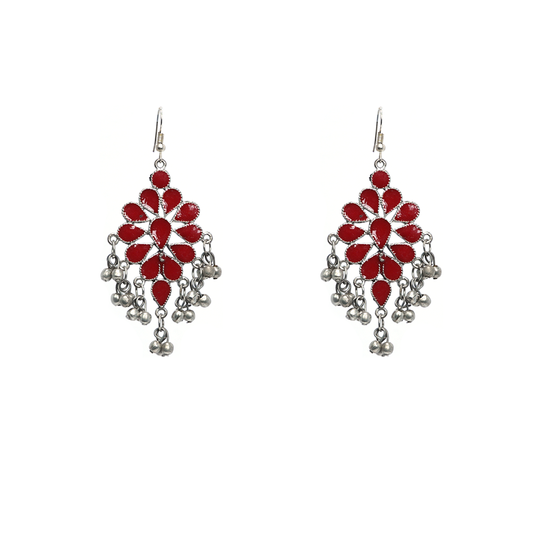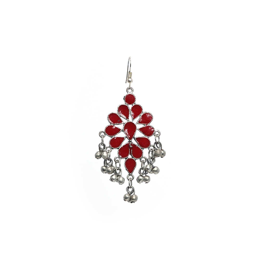 Aretes de hierro en color plateado y pedrería roja, hecho a mano en la India.