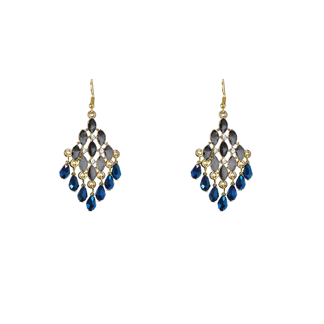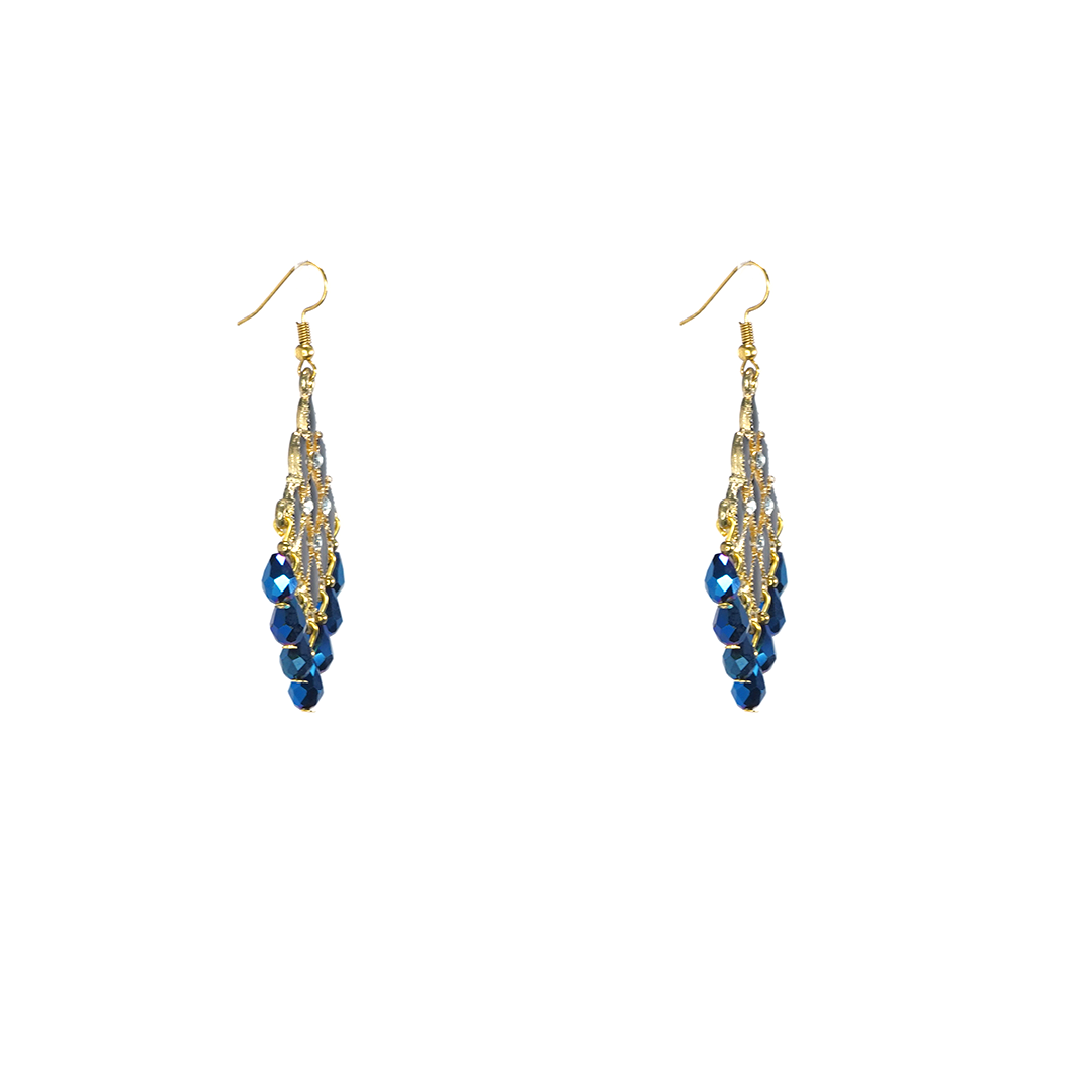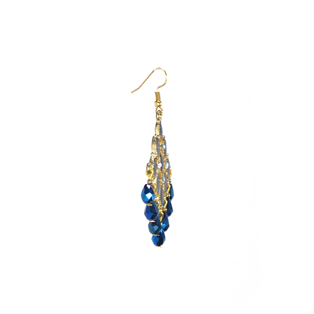 Aretes de hierro color dorado con pedrería azul y gris oscuro, hecho a mano en la India.