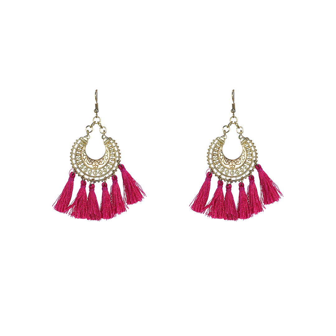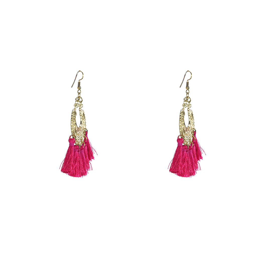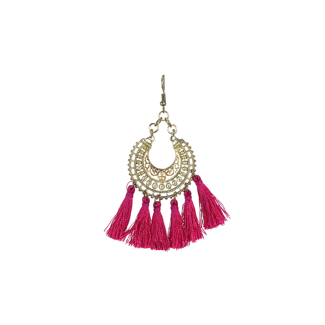 Aretes de hierro en color dorado y flequillos de hilo en color rosa, hecho a mano en la India