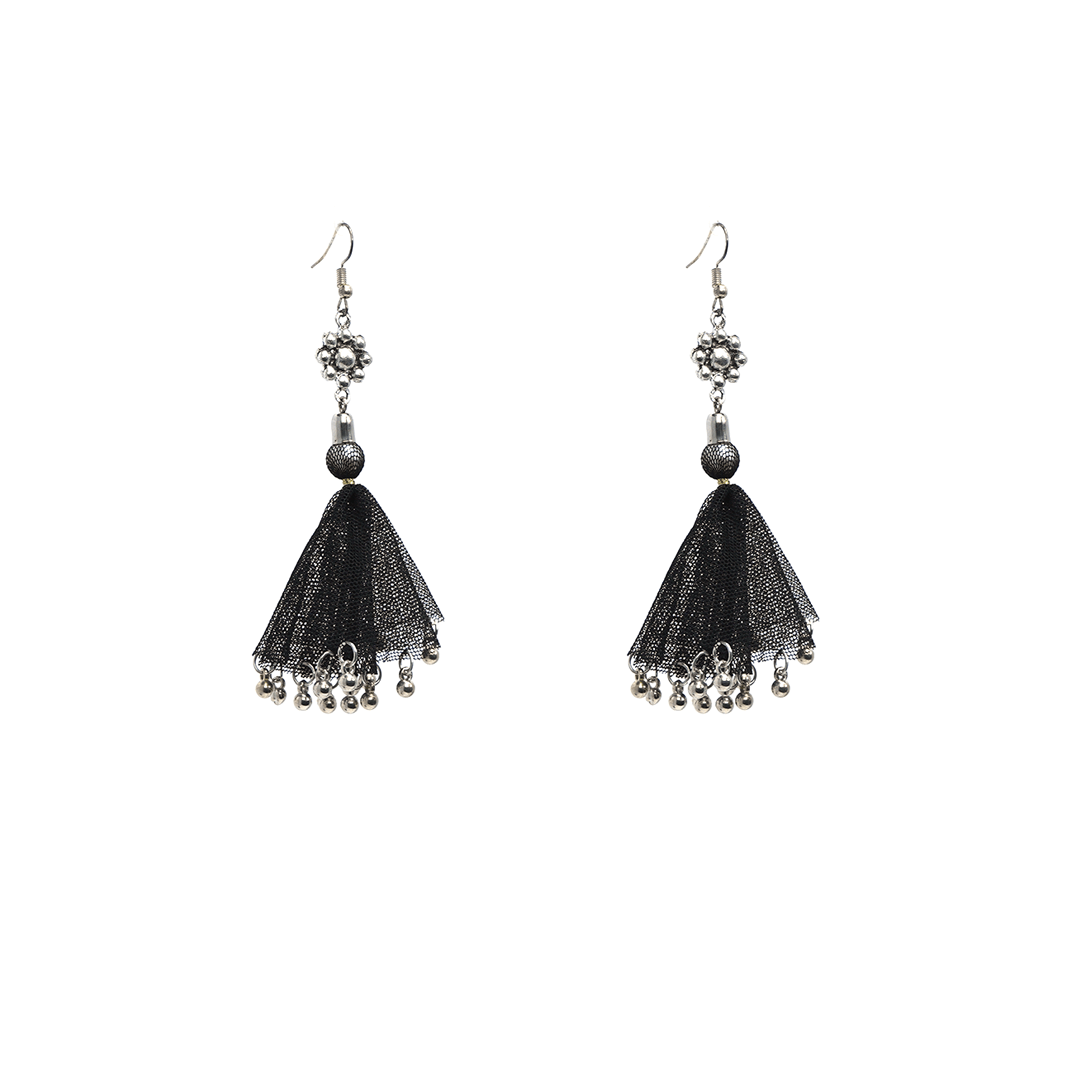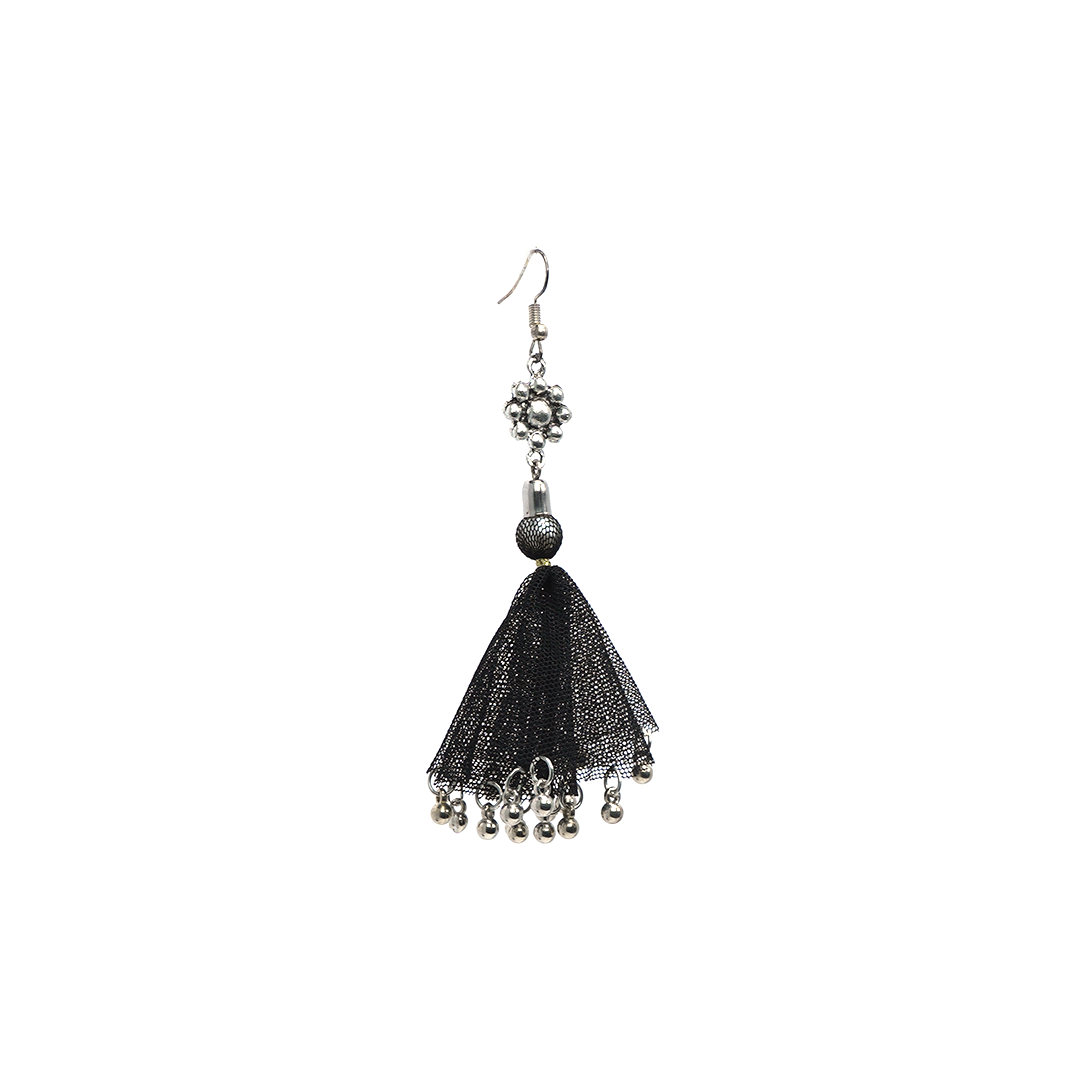 Aretes de hierro en color plateado con pendiente de mesh y dijes plateados, hecho a mano en la India.