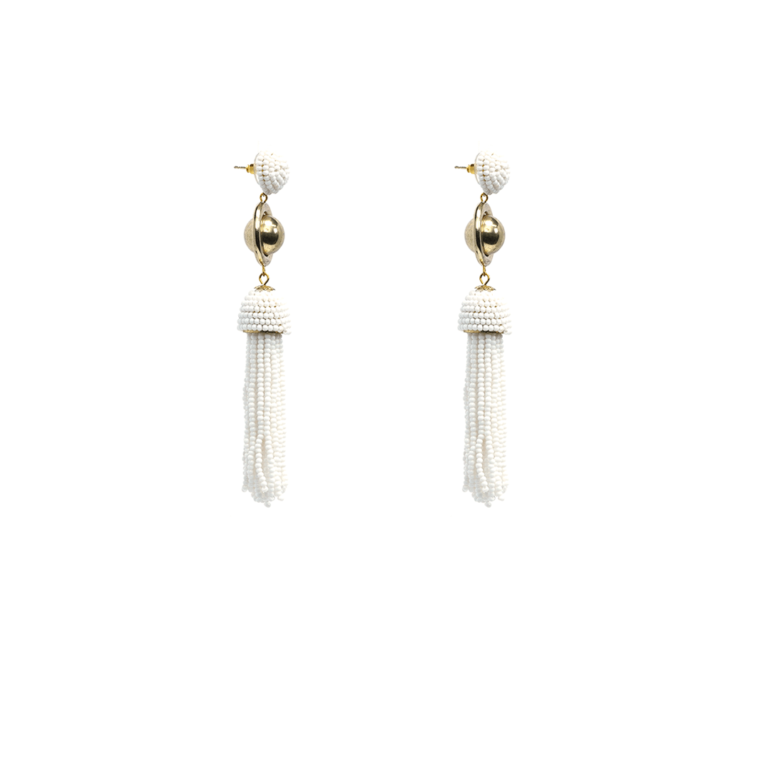 Aretes de hierro en color dorado y pedrería en color blanco, hecho a mano en la India.