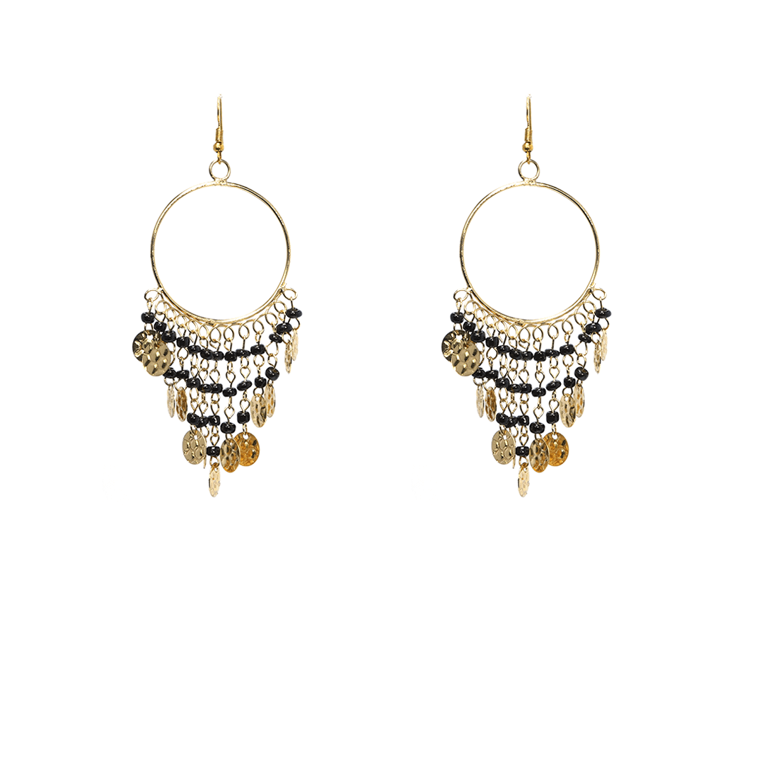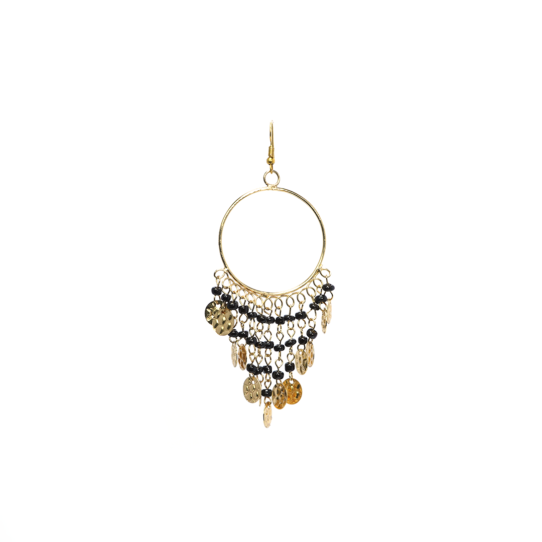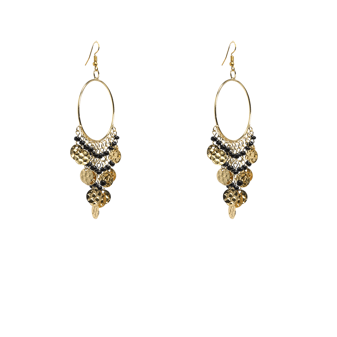 Aretes de hierro en color dorado con dijes tipo moneda y detalles en negro, hecho a mano en la India.