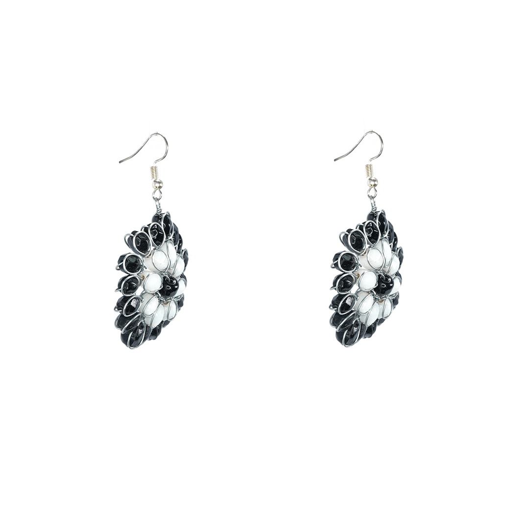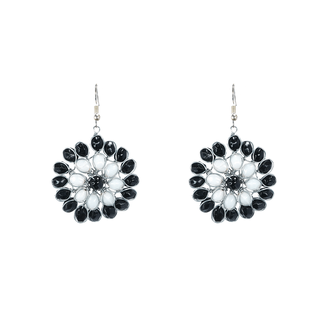 Aretes de hierro en color plateado con pedrería tejida en forma de flor, hecho a mano en la India.