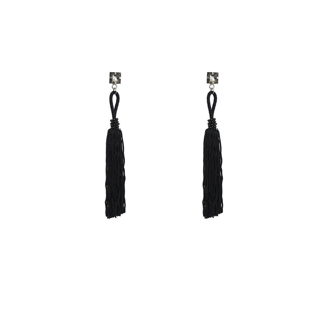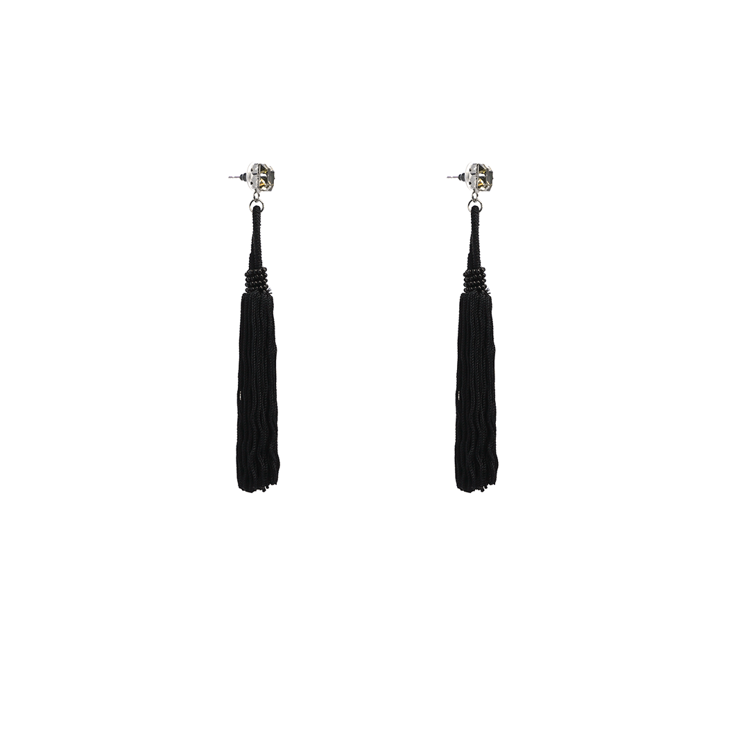 Aretes de hierro con pedrería en tono tornasol y flecos de hilo en color negro, hecho a mano en la India.