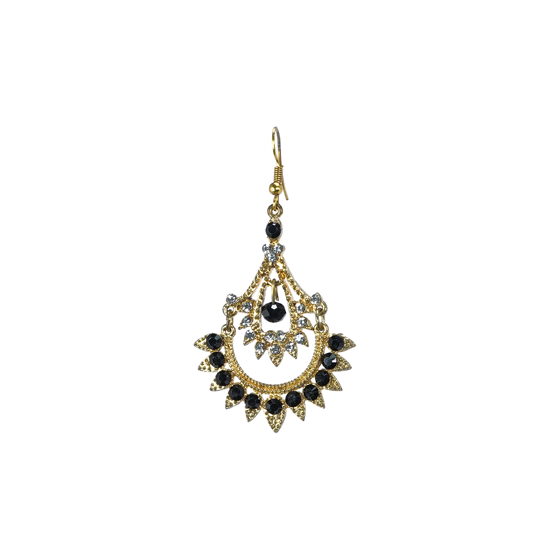 Aretes de hierro color dorado con detalles en negro y plata, hecho a mano en la India.