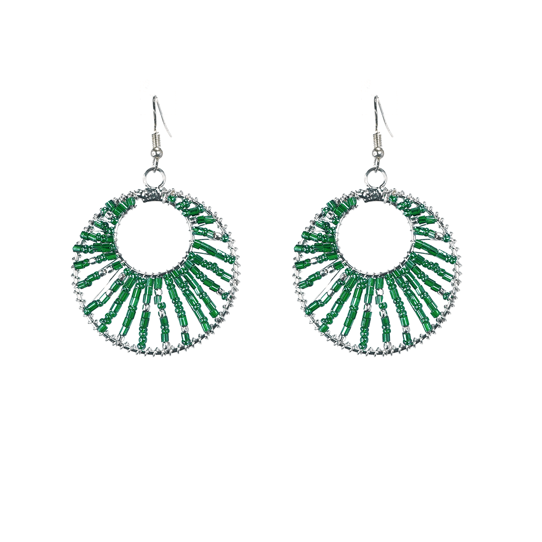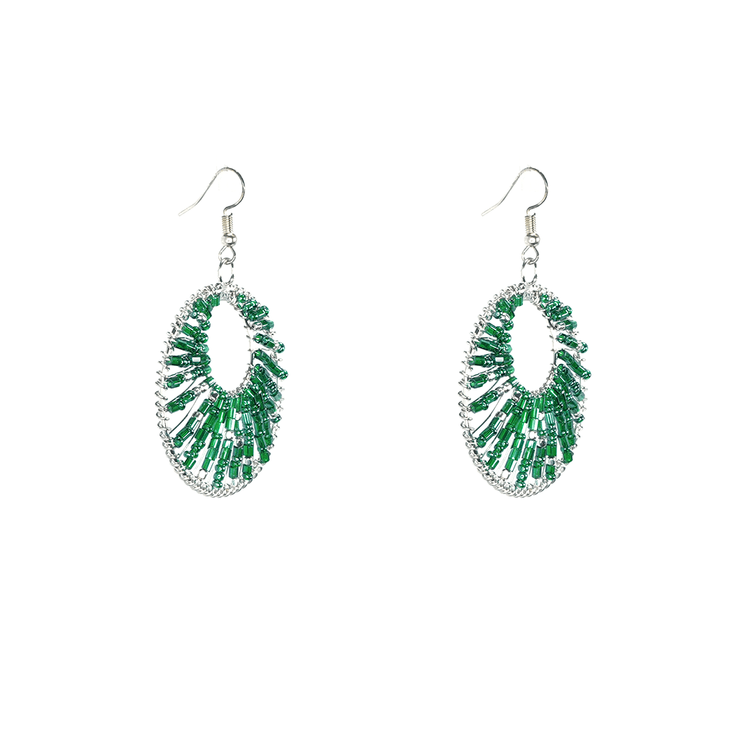 Aretes de hierro en color plateado y pedrería en color verde, hecho a mano en la India.