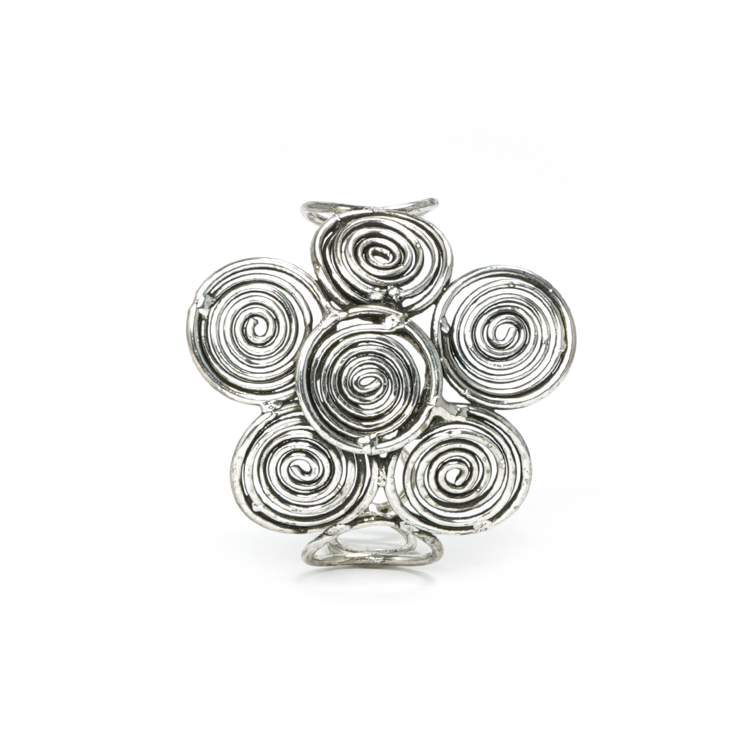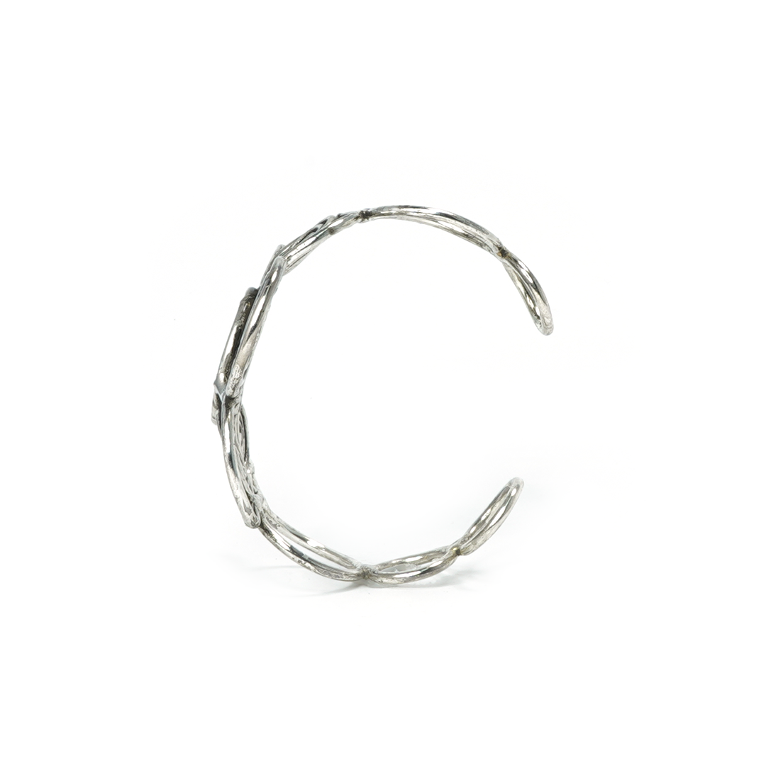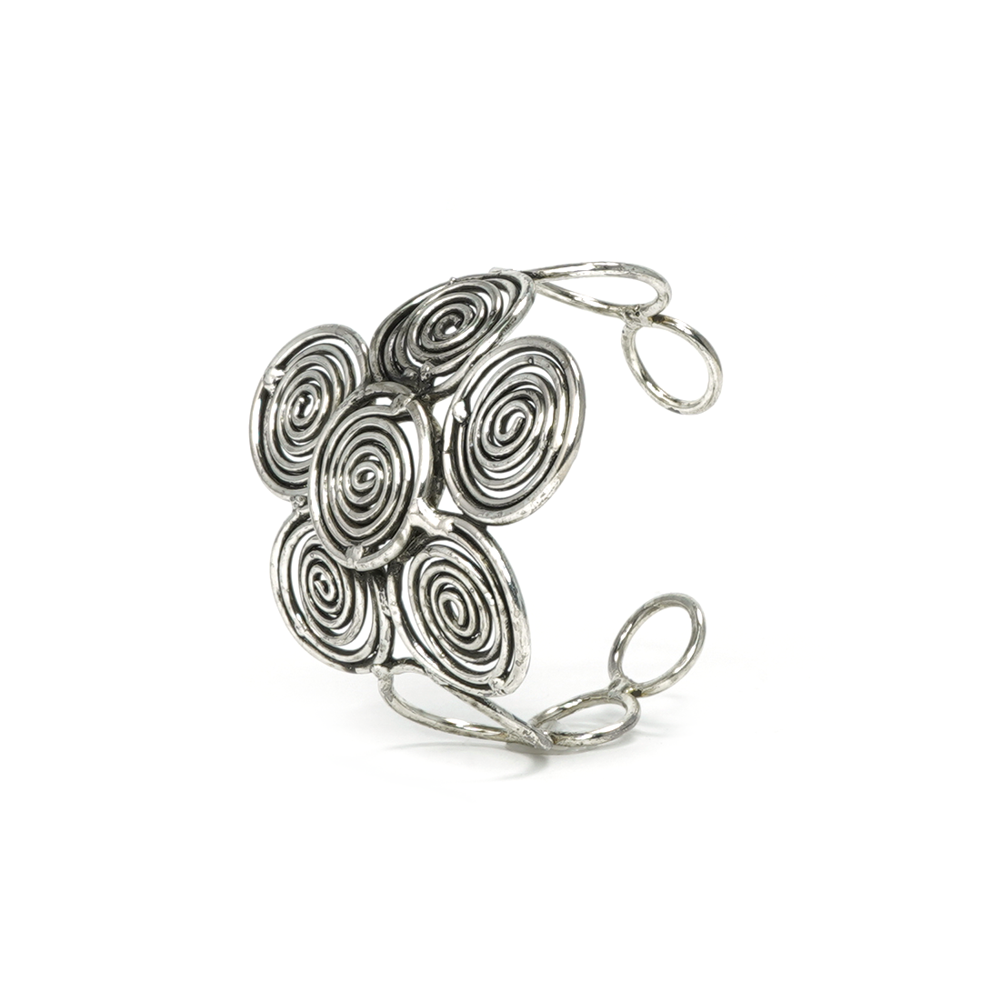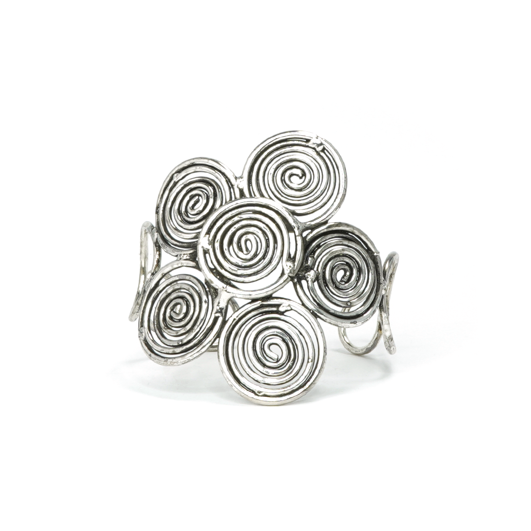 Brazalete de hierro en color plateado con varillas formadas en espiral, traído desde la India.