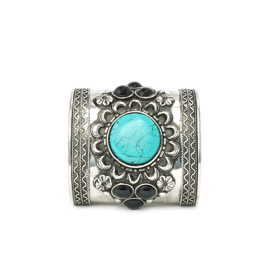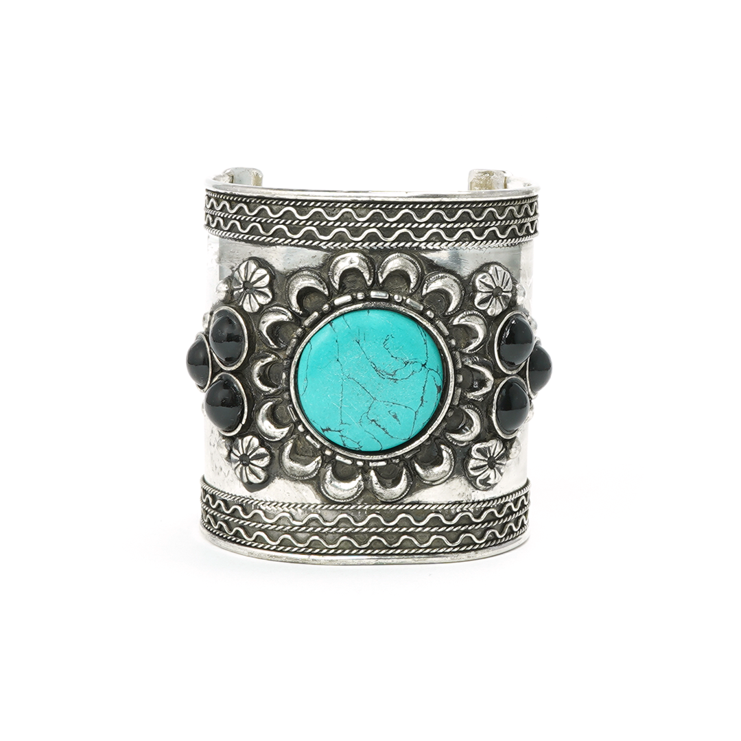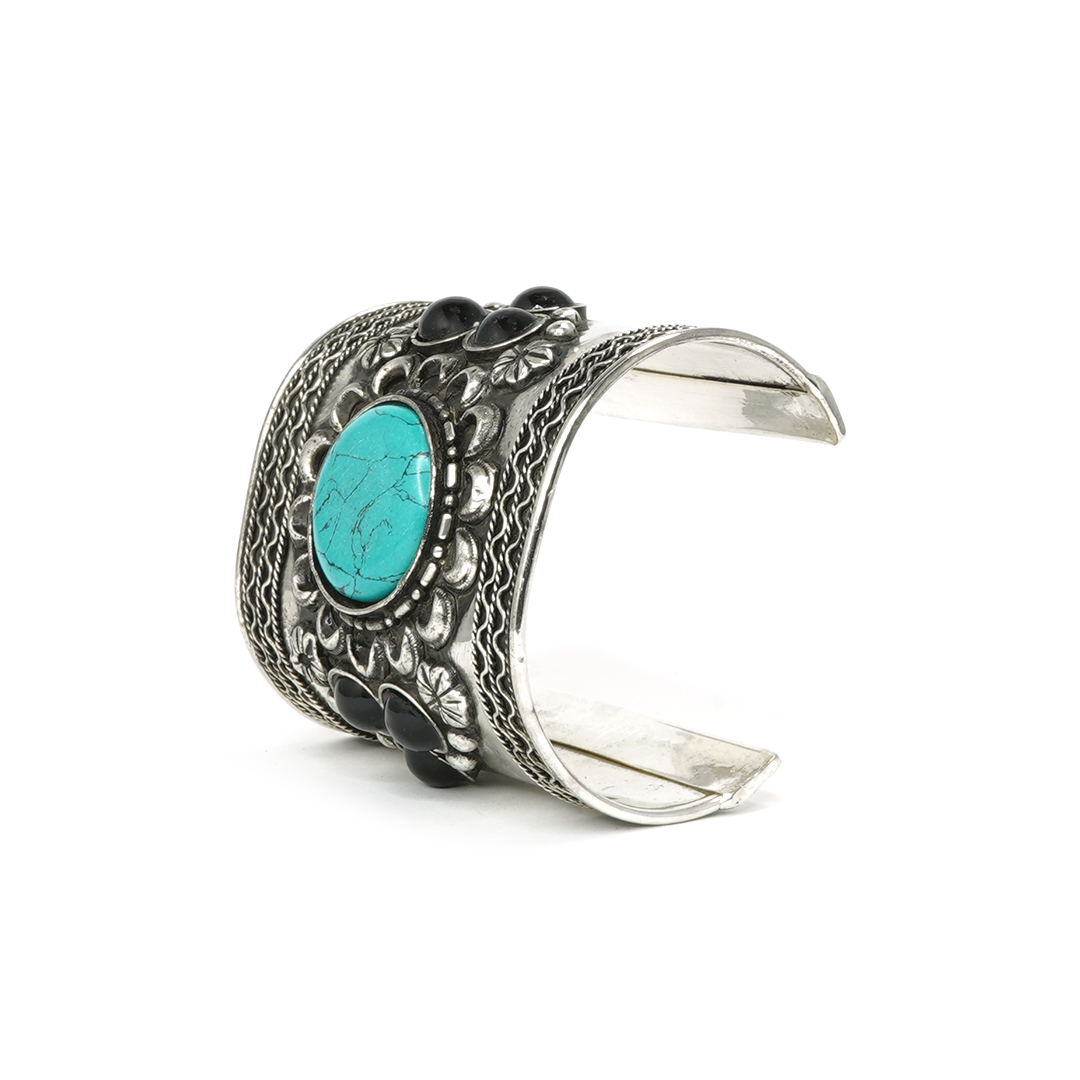 Brazalete de hierro plateado con motivos florales y pedrería en color turquesa y negro, traído desde la india.