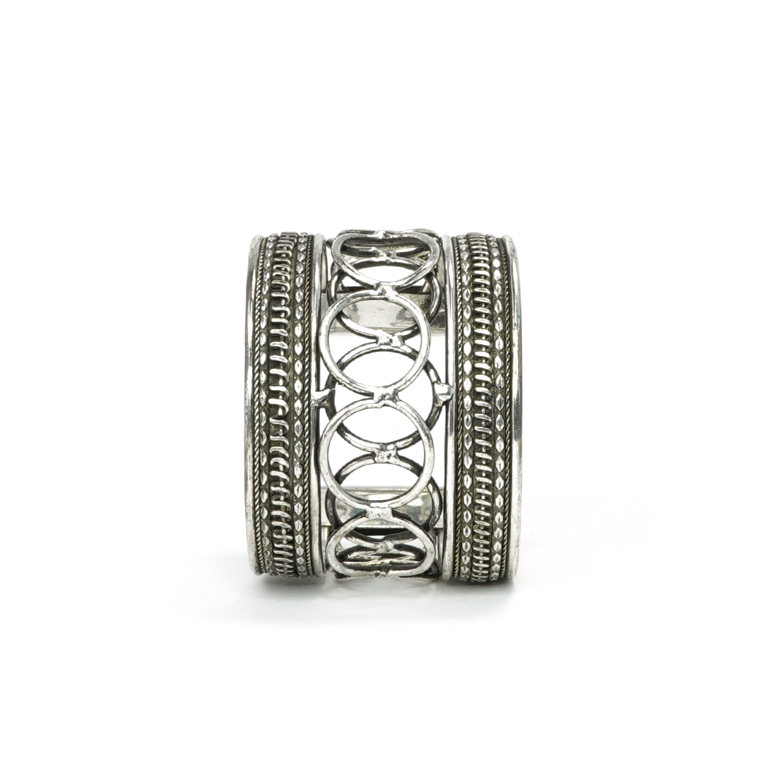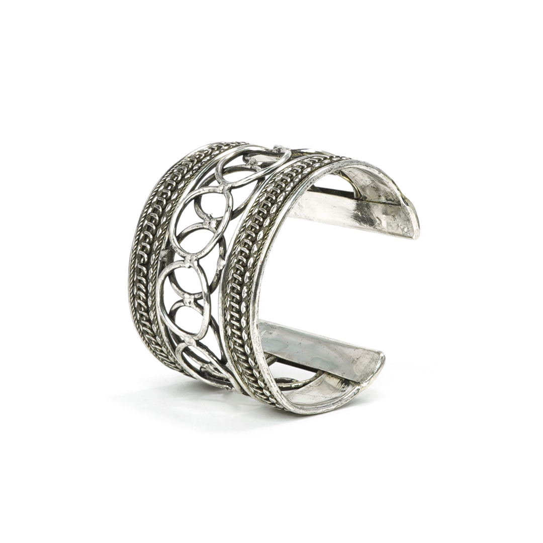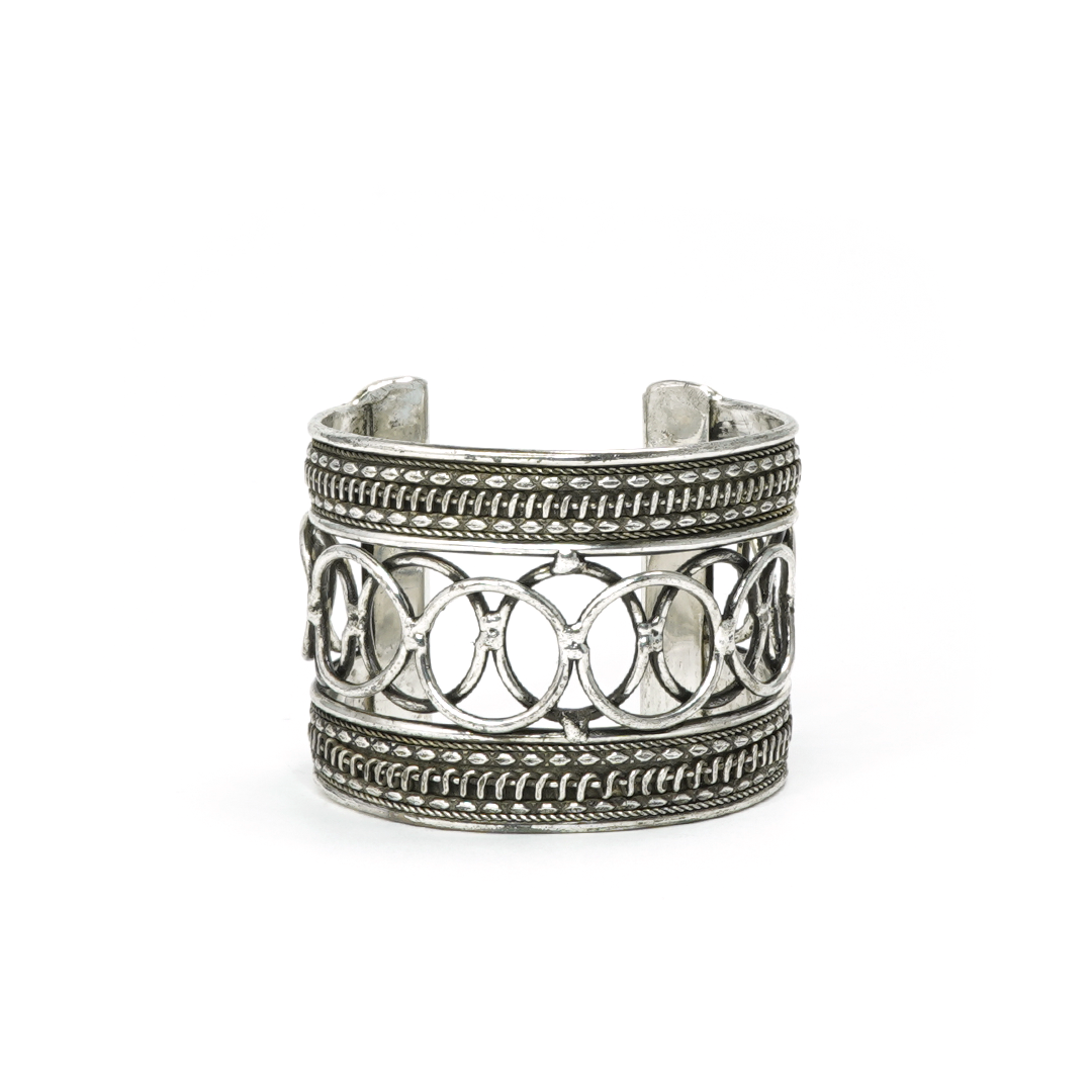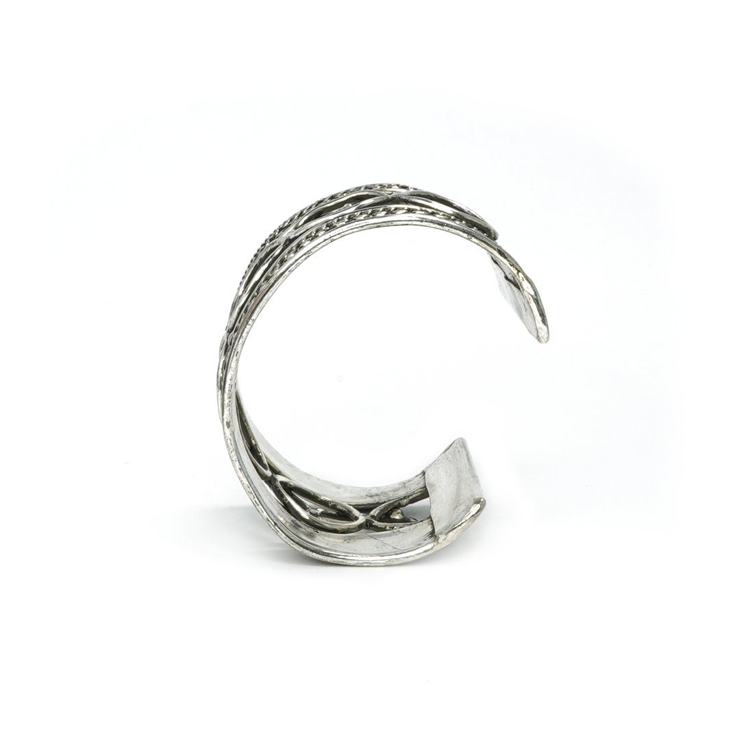 Brazalete de hierro en color plateado con argollas entrelazadas alrededor, traído desde la India.