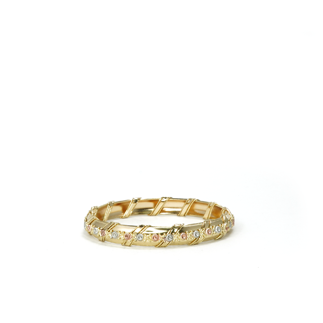 Brazalete de hierro en color dorado con detalles plateados y cobrizos al contorno, traído desde la India.