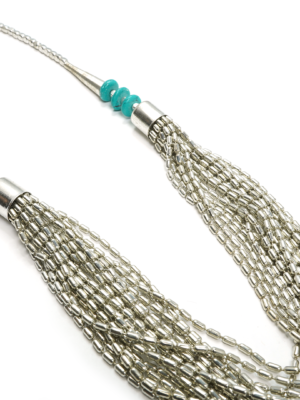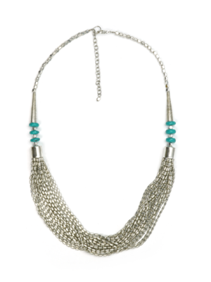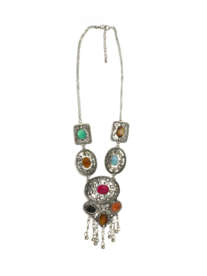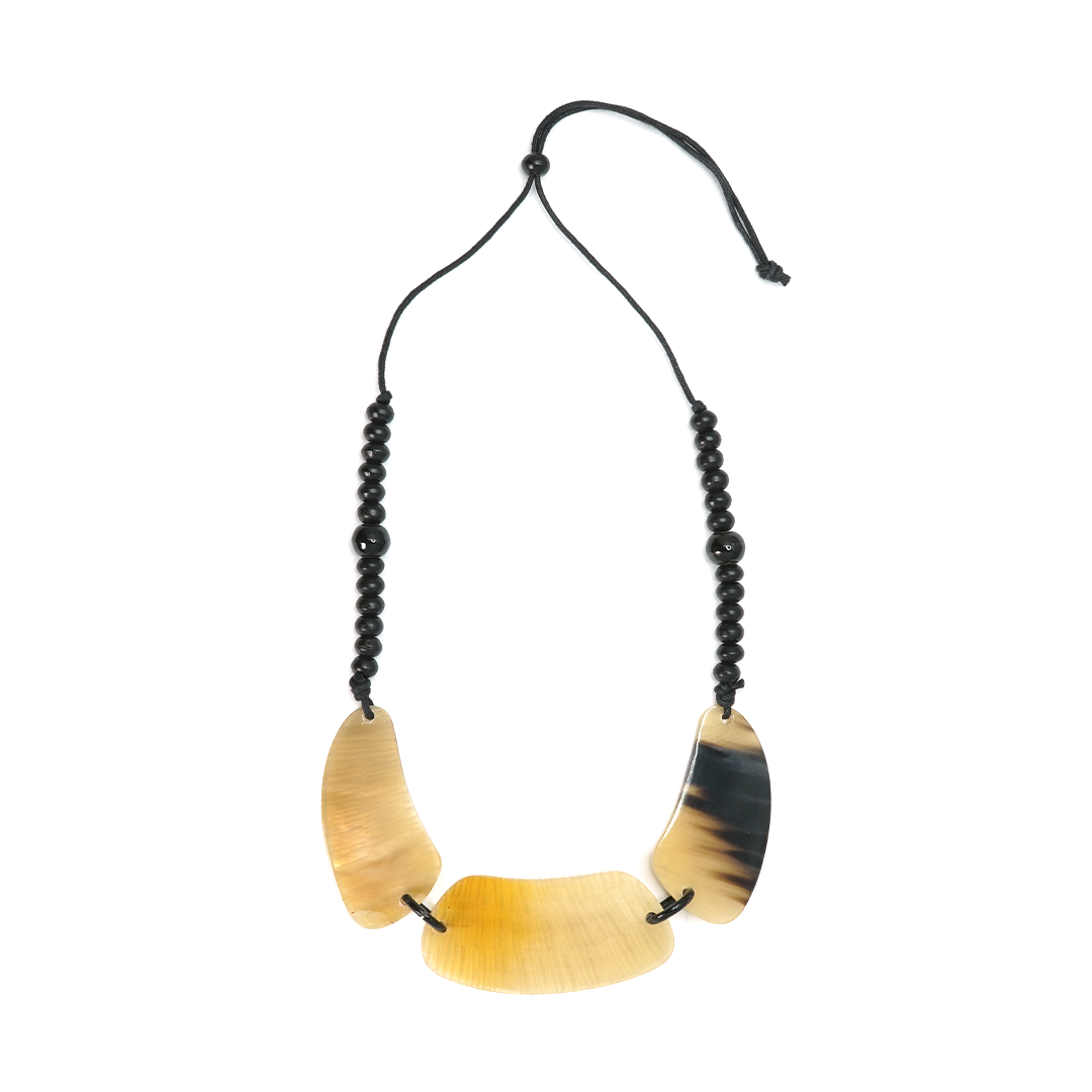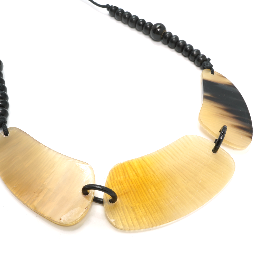 Collar de listón negro con pedrería negra y dijes de resina en color café y hueso, traído desde la India.