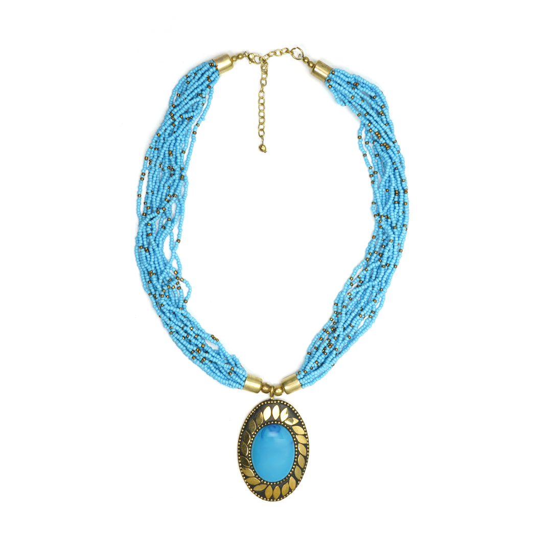 Collar de Hierro con pedrería en color azul cielo y dije circular con contorno dorado, traído desde la India.