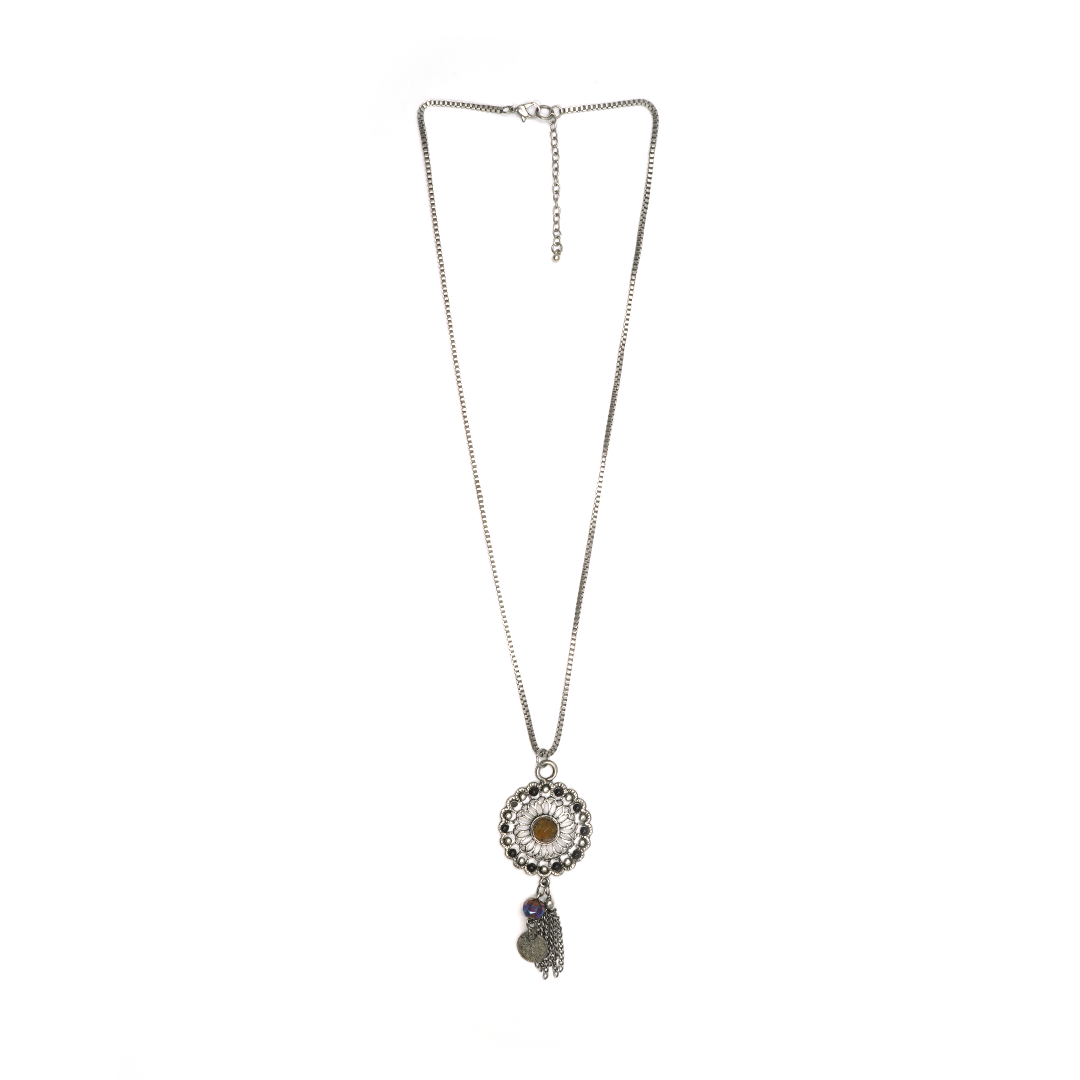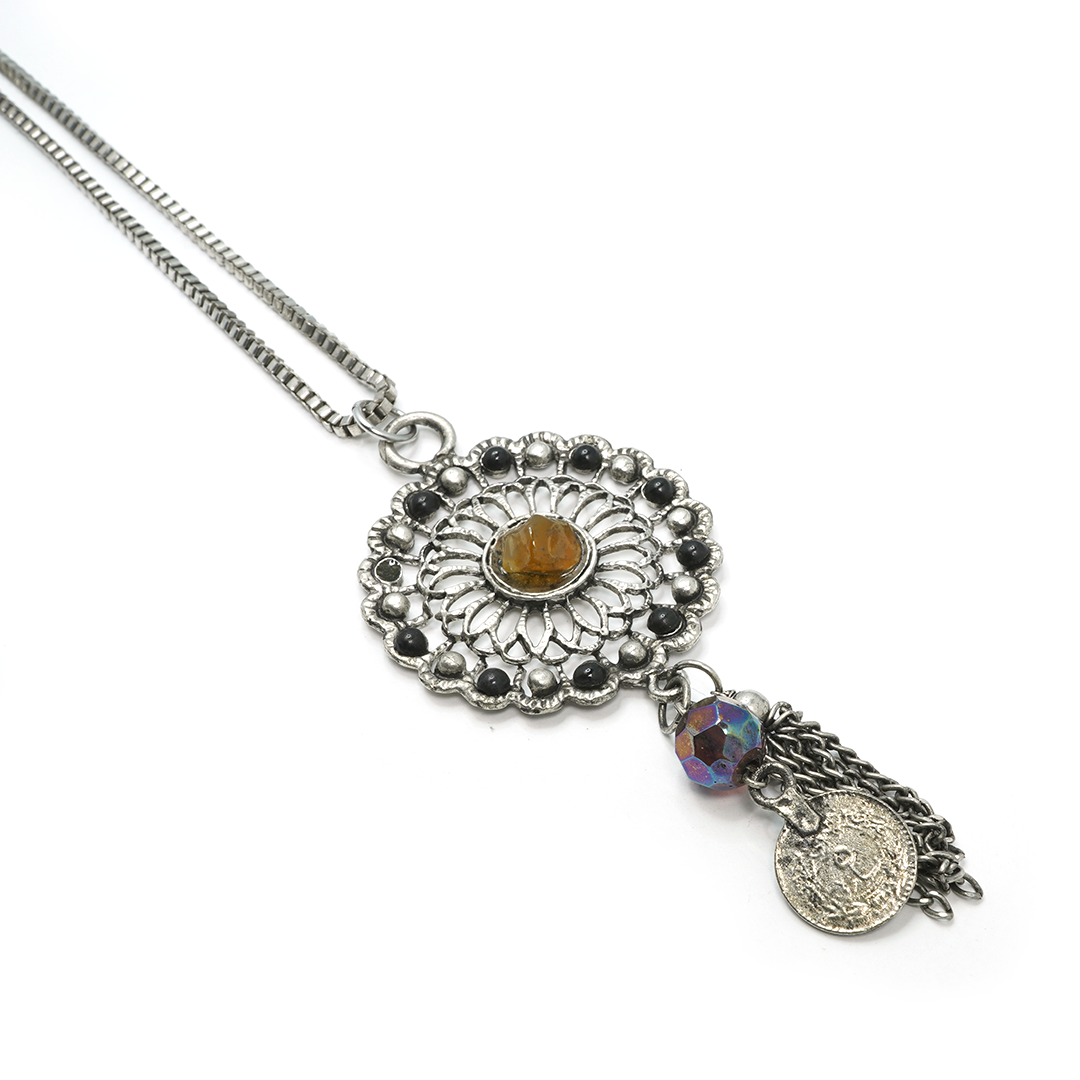 Collar de hierro 100% con dije de mandala circular y pedrería en color negro, ámbar y plateado, traído desde la India.