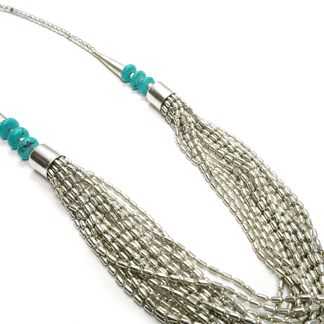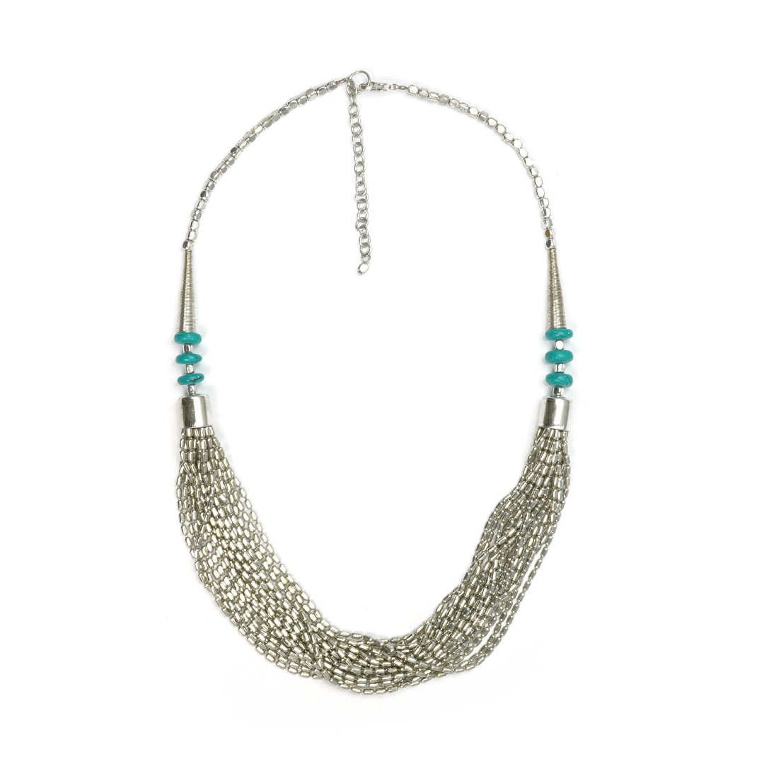 Collar de hierro con pedrería en color turquesa marmoleado y elegante caída con pedrería plateada, traído desde la India.