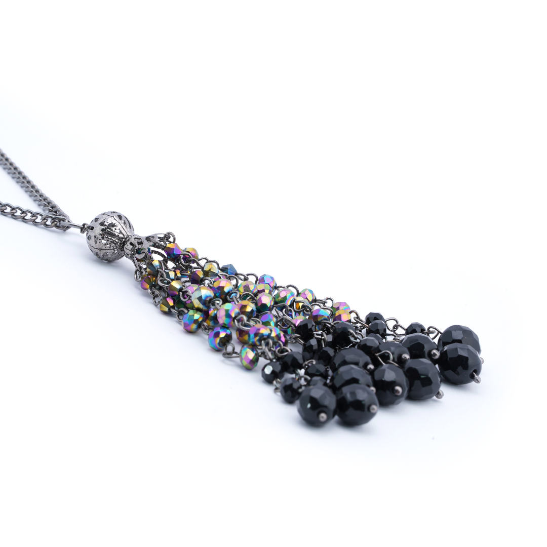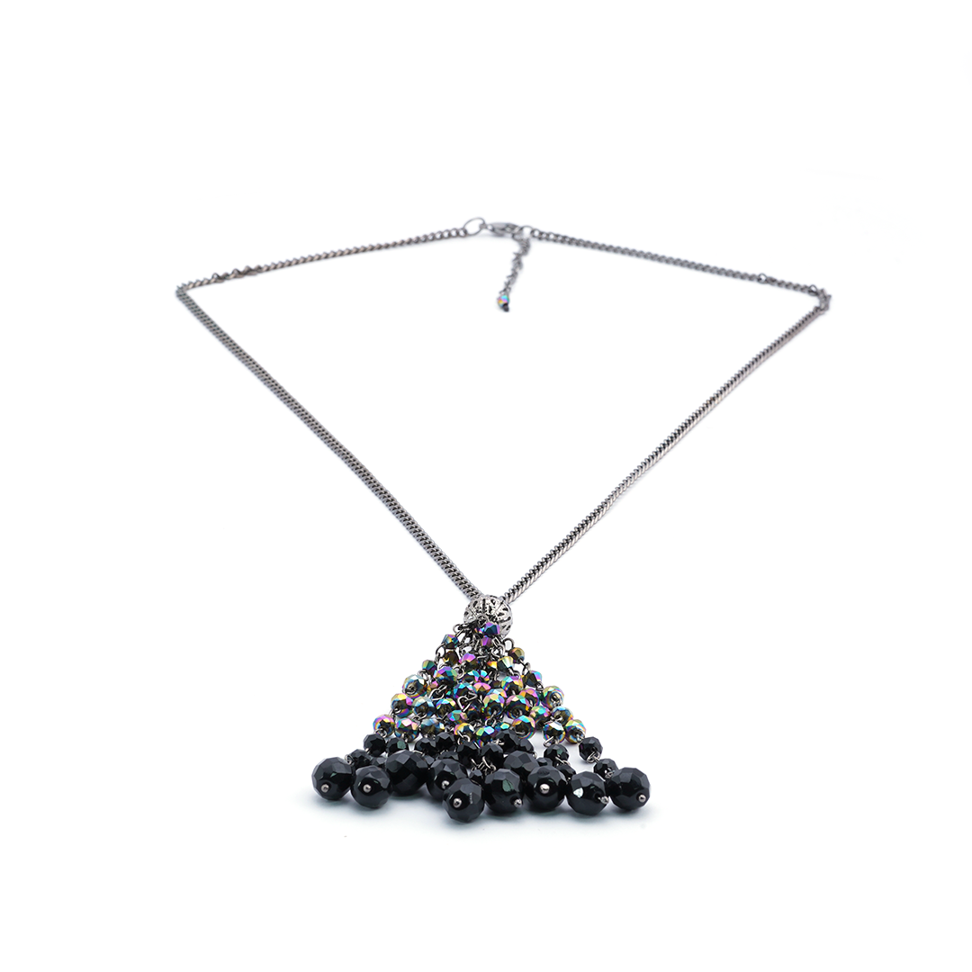 $309.99Collar de hierro plateado con pedrería en color negro, listón negro y cadenas plateadas.
