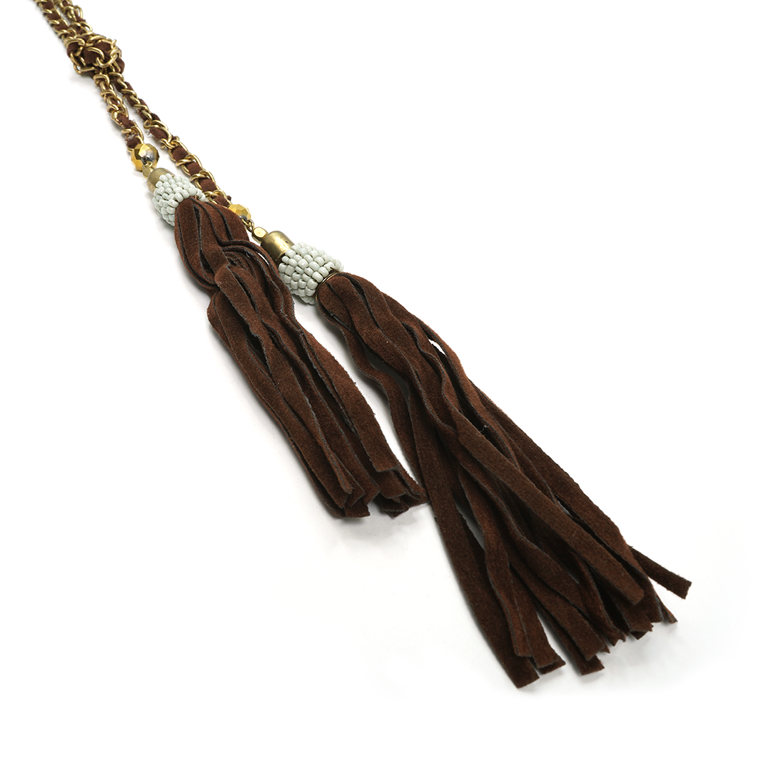 Collar de hierro, pedrería y listón de piel sintética en color café, detalles en blanco y dorado.