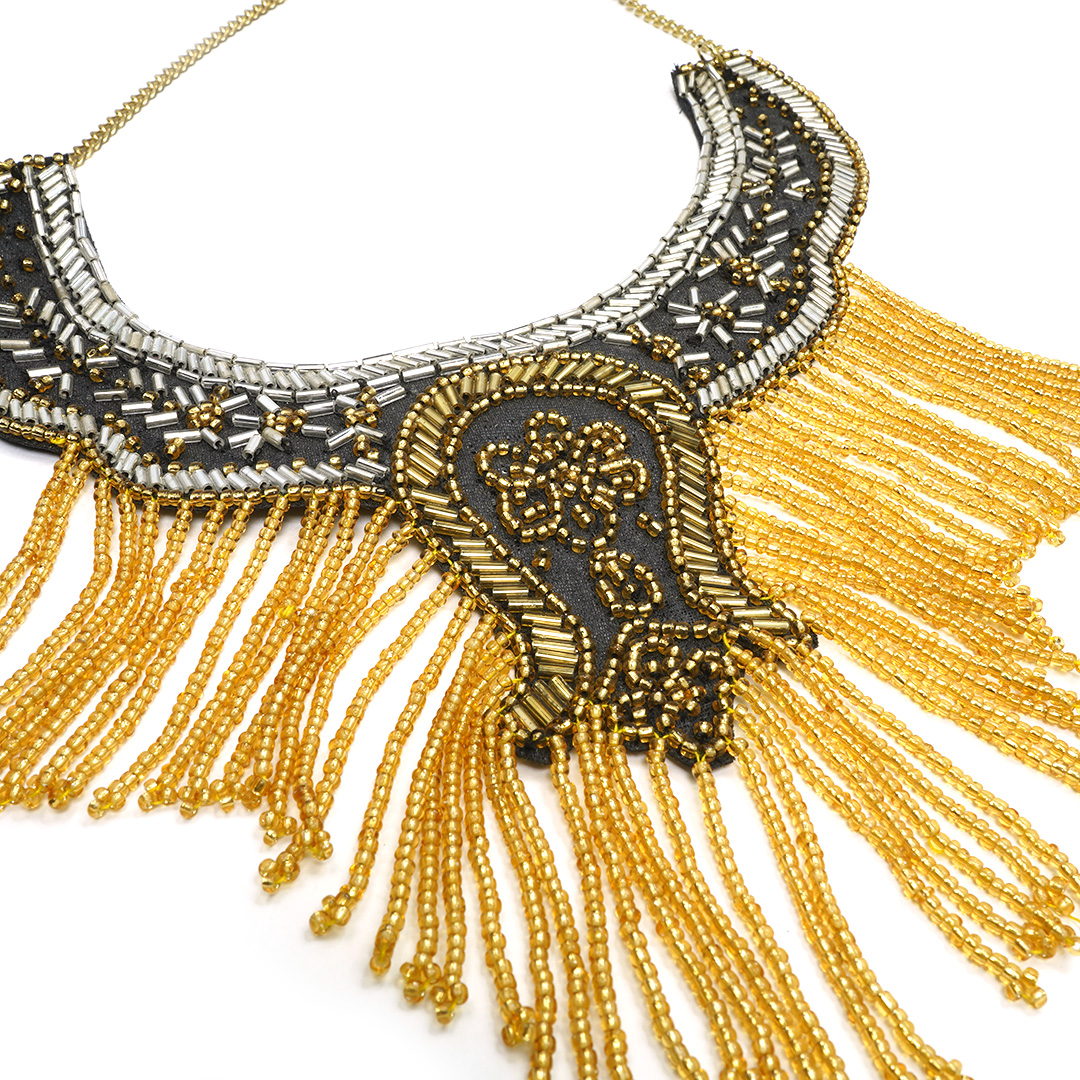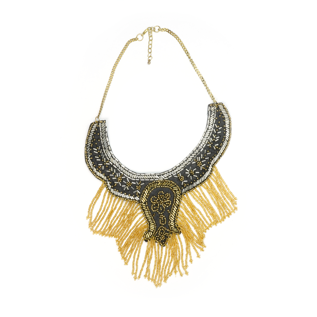 Collar de hierro con pedrería en tonos dorados y plateados bordada a mano, traído desde la India.
