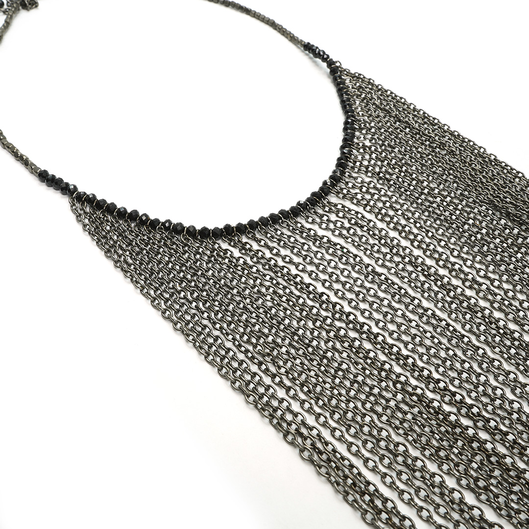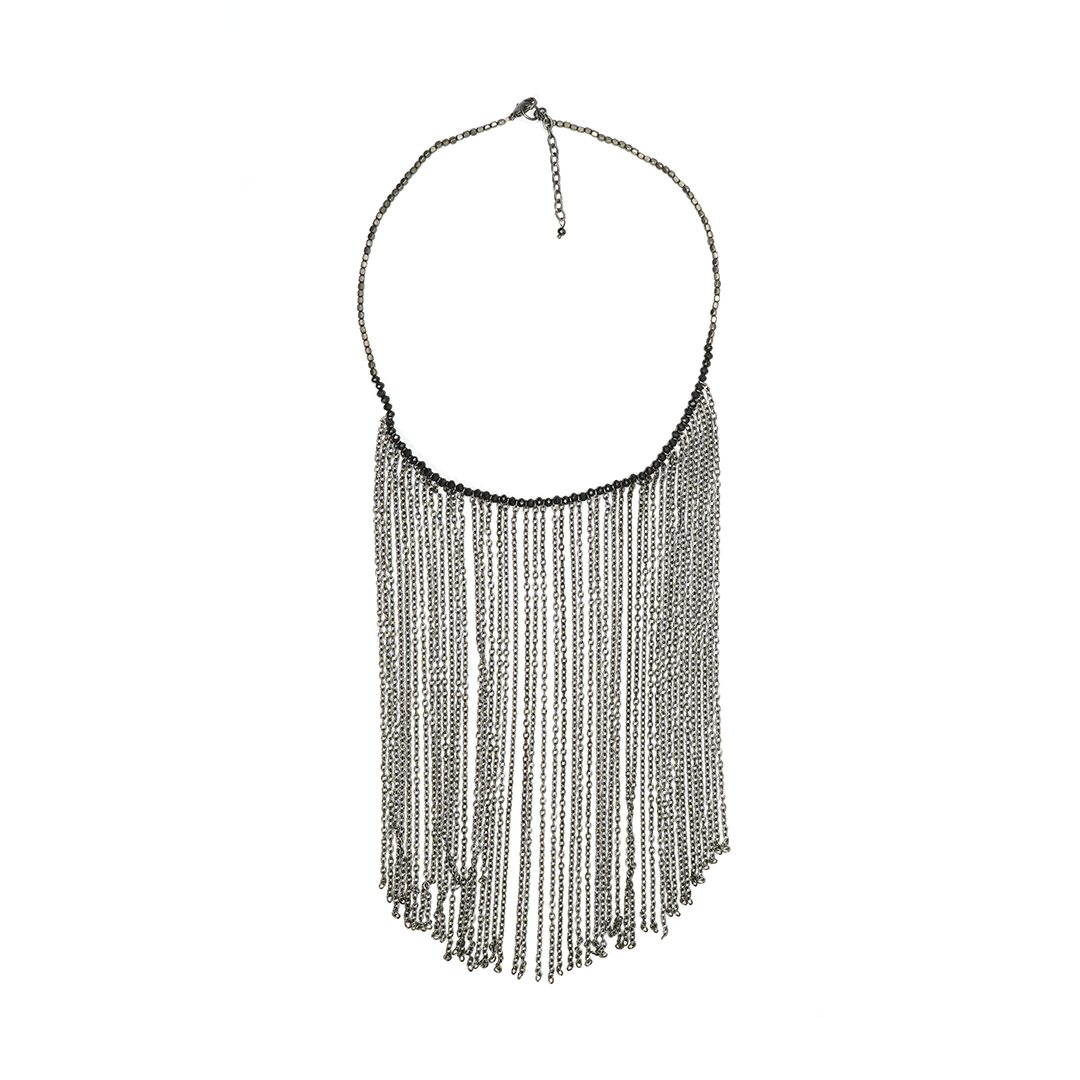 Collar de hierro y pedrería en color negro, con cadenas que caen al escote, traído desde la India.