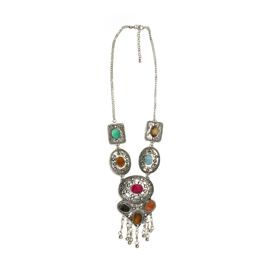 Collar de hierro plateado con pedrería en color café, rosa, azul y turquesa, traído desde la India.