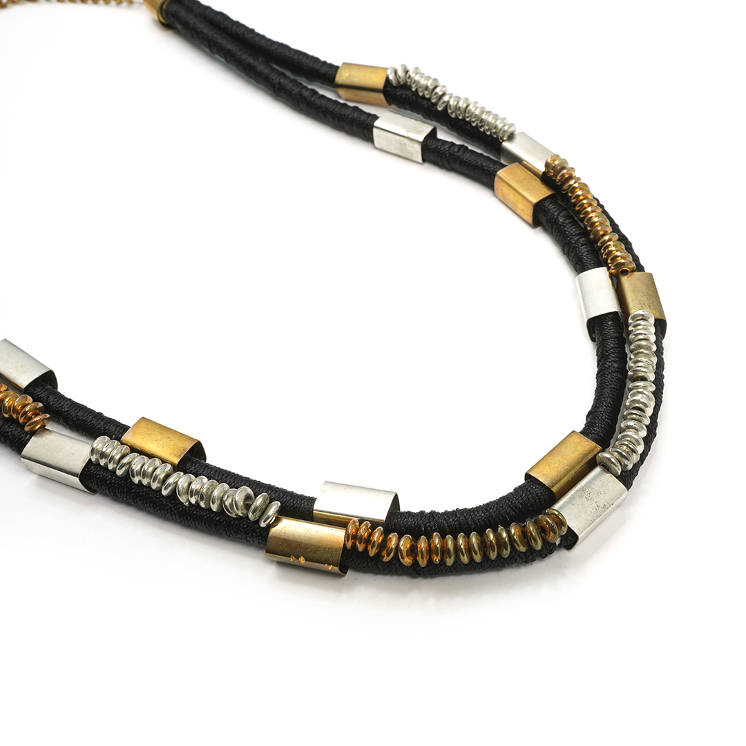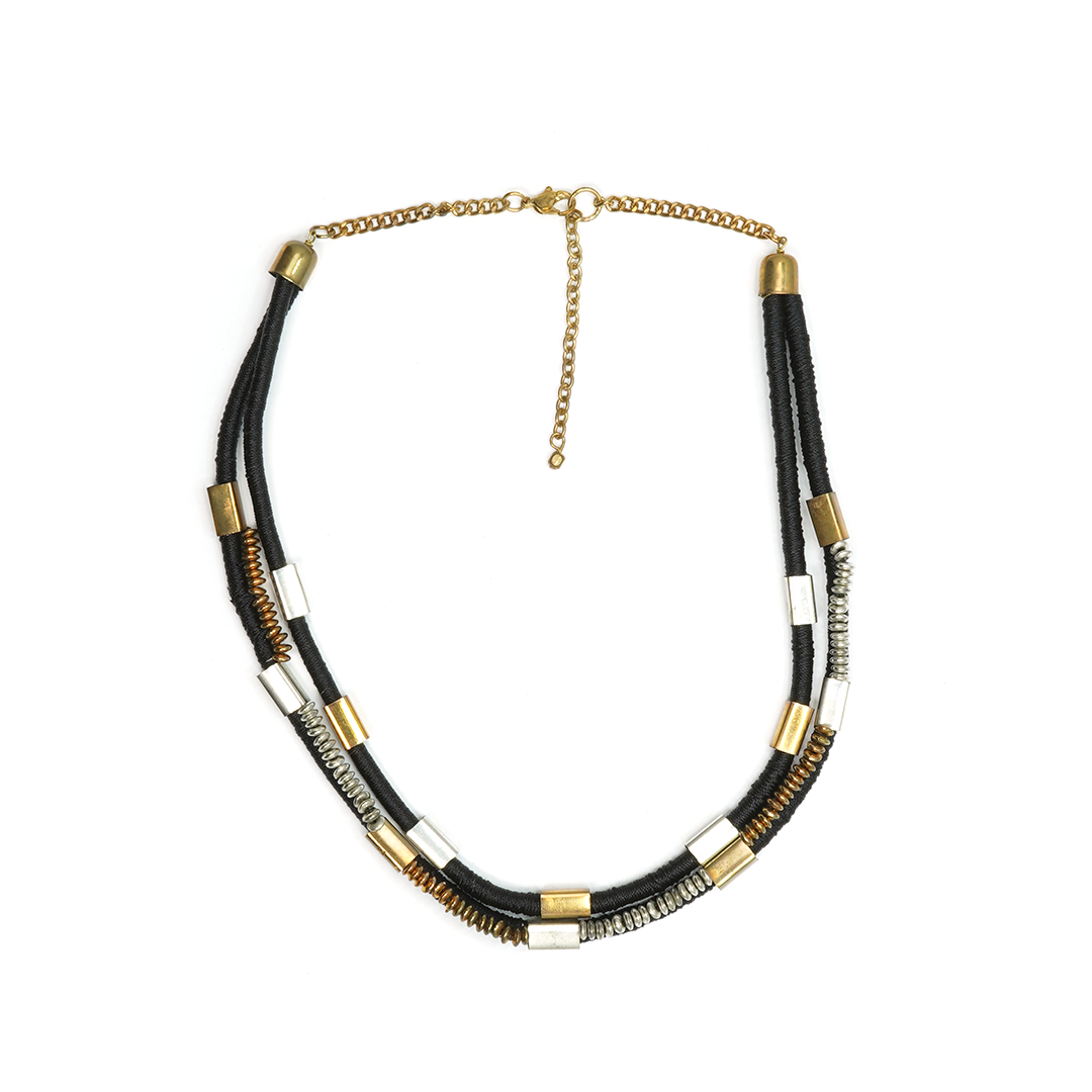 Collar de hierro con hilo en color negro, apliques en forma rectangular y cuentas en color dorado y plateado.