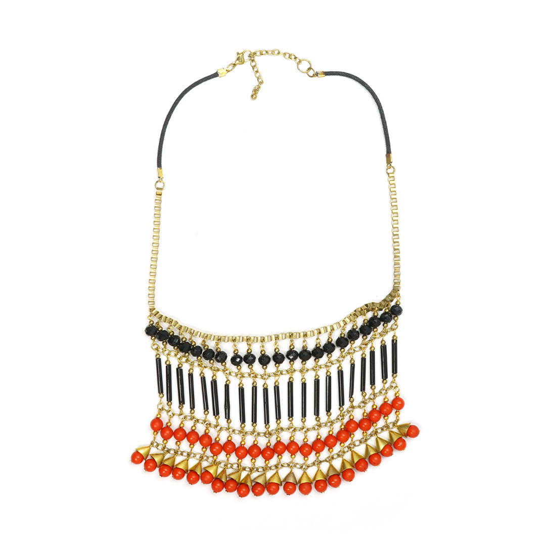 Collar de hierro en color dorado y pedrería en tonos negro y rojo, traídos desde la India
