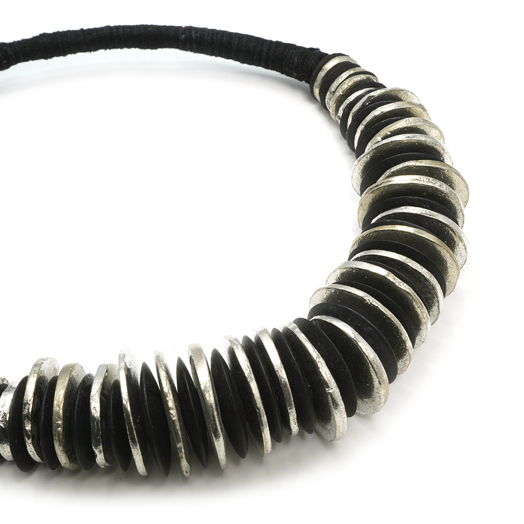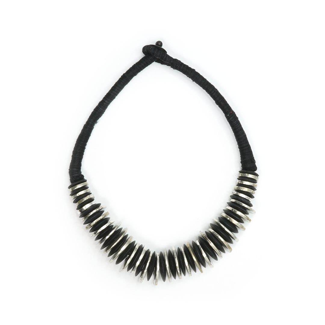Collar de cordón en color negro y discos de hierro en color plateado, traído desde la India.