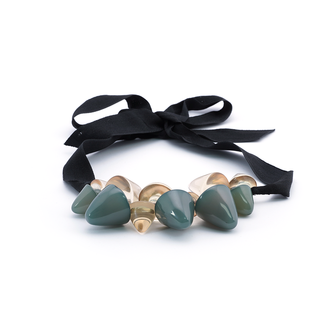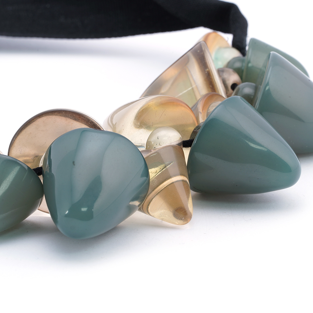 Collar de llamativos dijes en colores verde y amarillo, hecho a mano en la India.