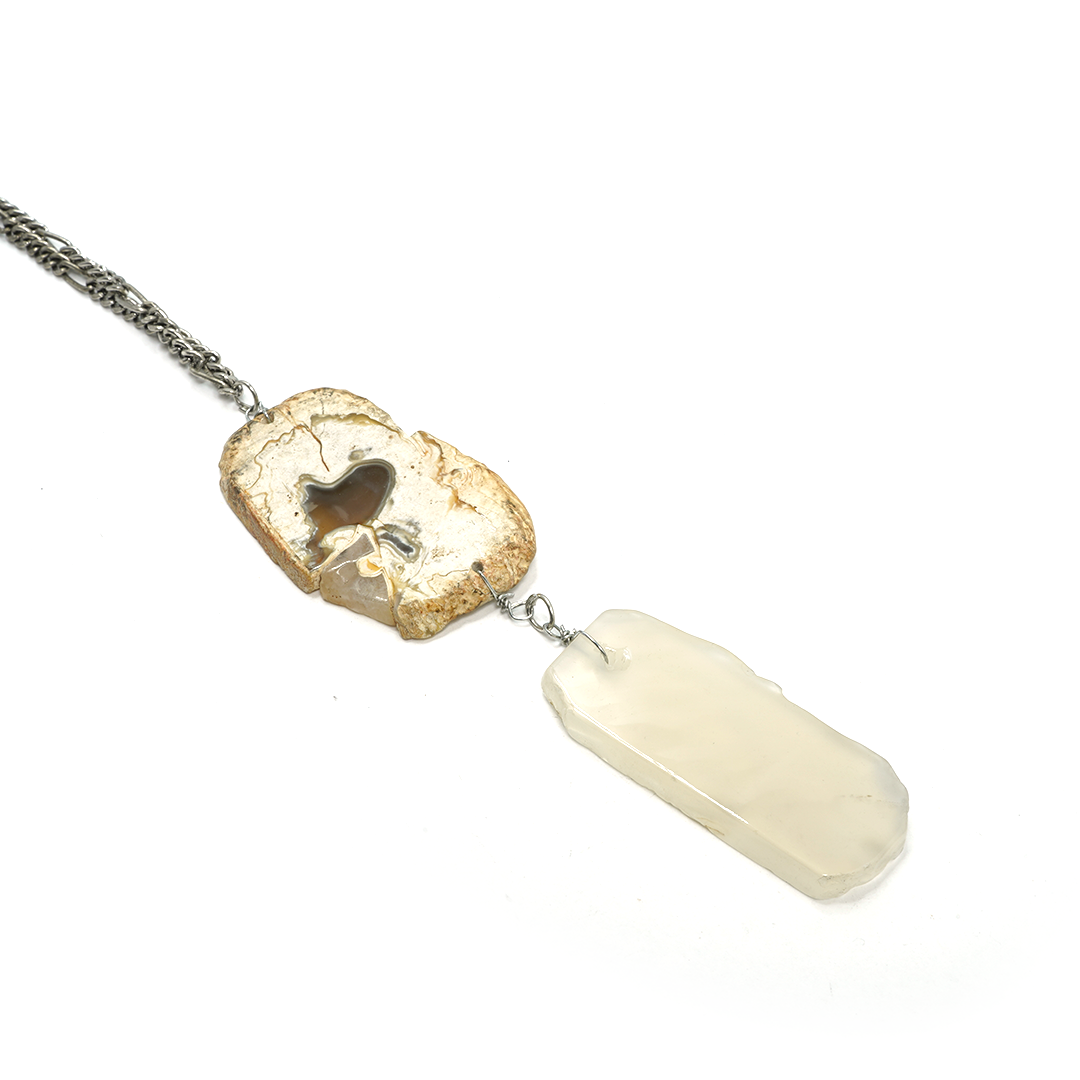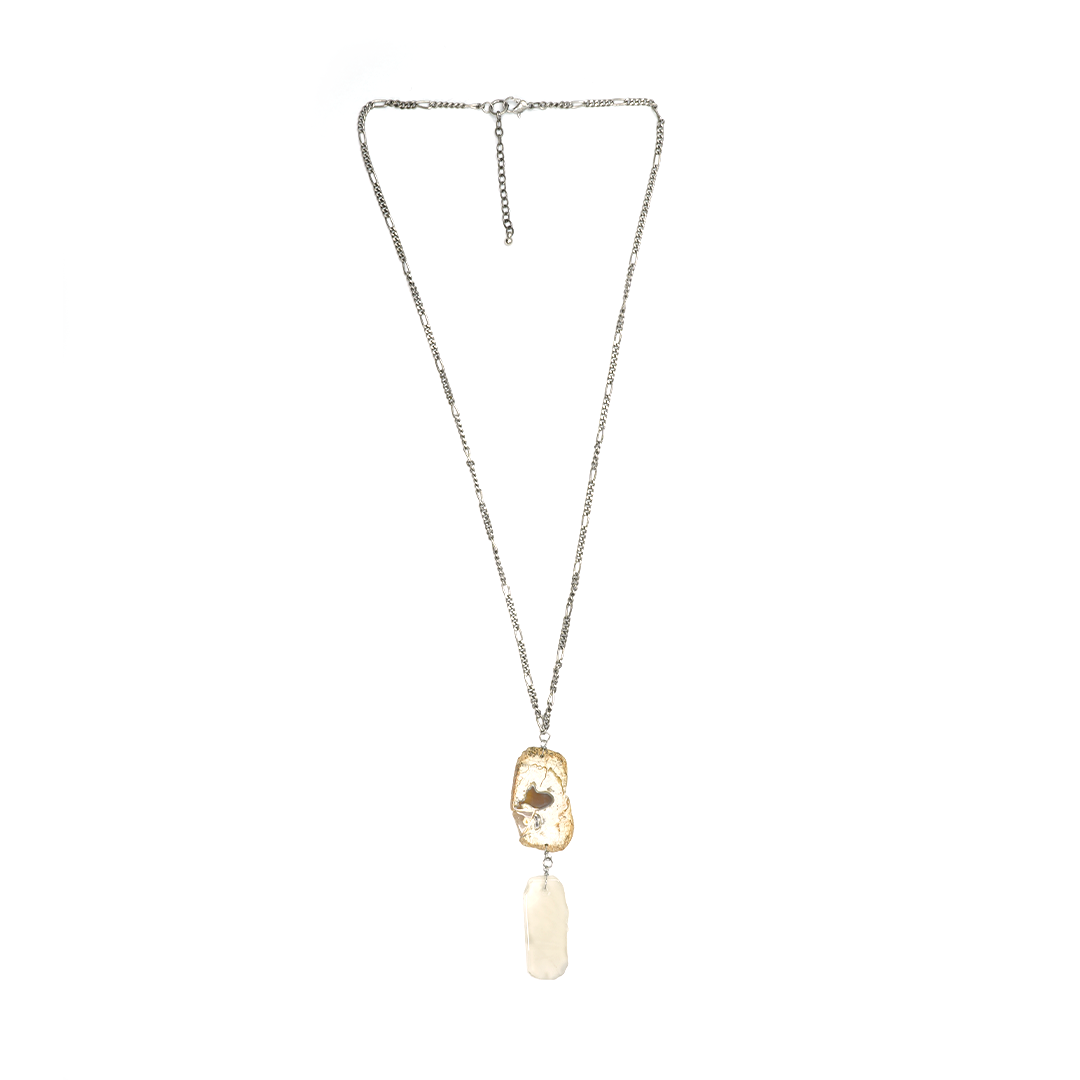 Collar de hierro con pedrería en tonos cristal y café, con cadena plateada, traído desde la India.