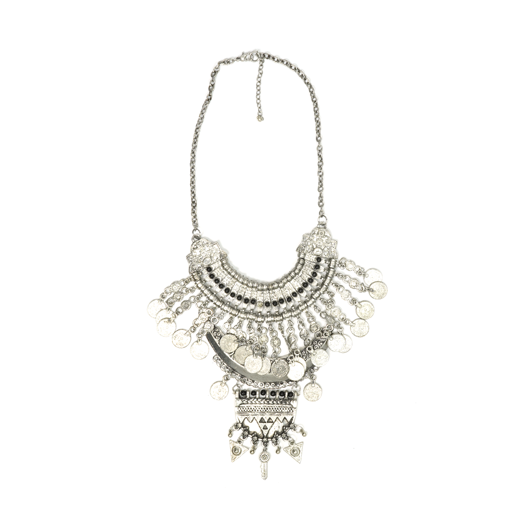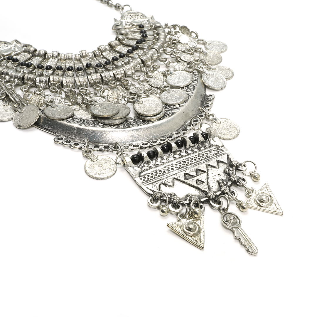 Collar de hierro 100% color plateado con dijes de monedas, triángulos y llaves, con detalles en color negro, traído desde la India.