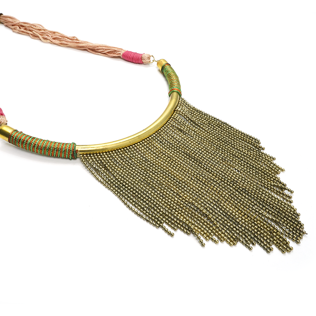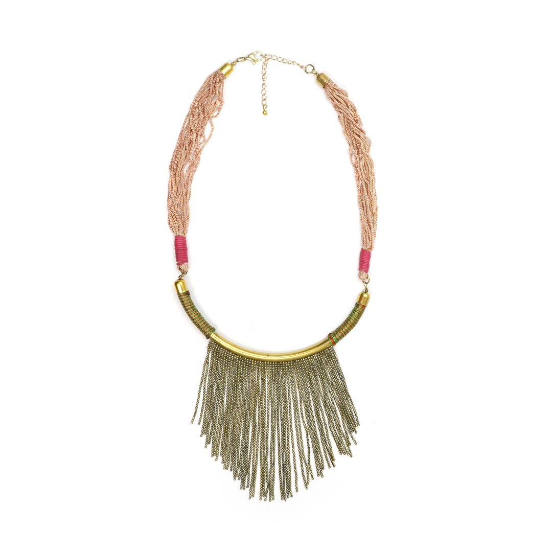 Collar de hierro en color dorado con cadenas y cordones en tonos rosa, traído desde la India.