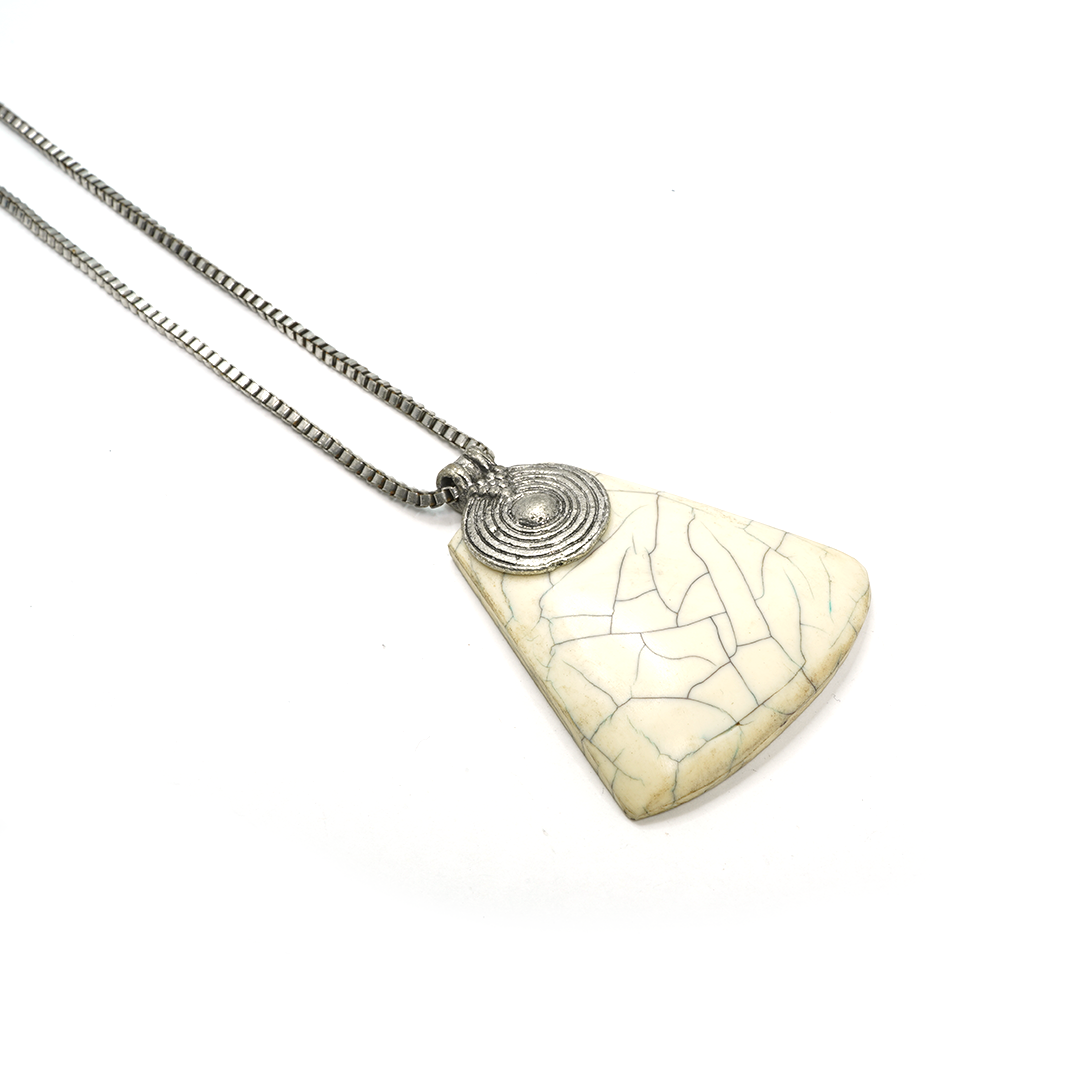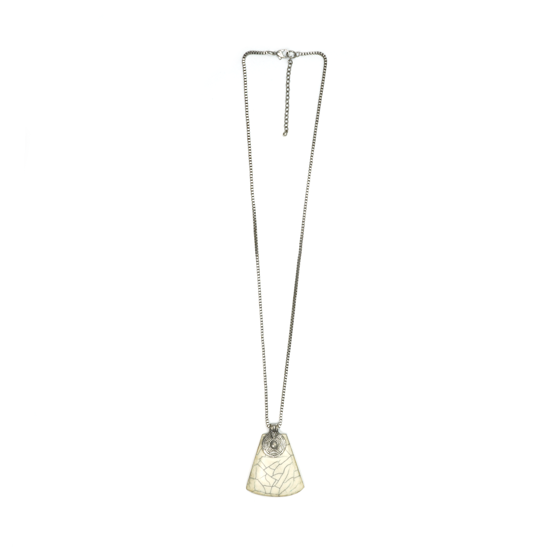 Collar de hierro y dije de resina en forma triangular en color blanco marmoleado, traído desde la India.