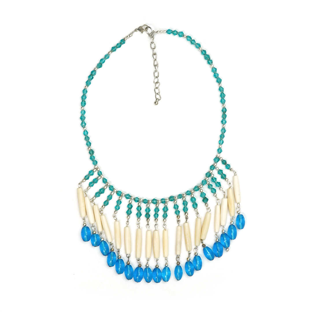 Collar de hierro y pedrería de la india en colores turquesa, hueso y azul claro con una elegante caída, traído desde la india.