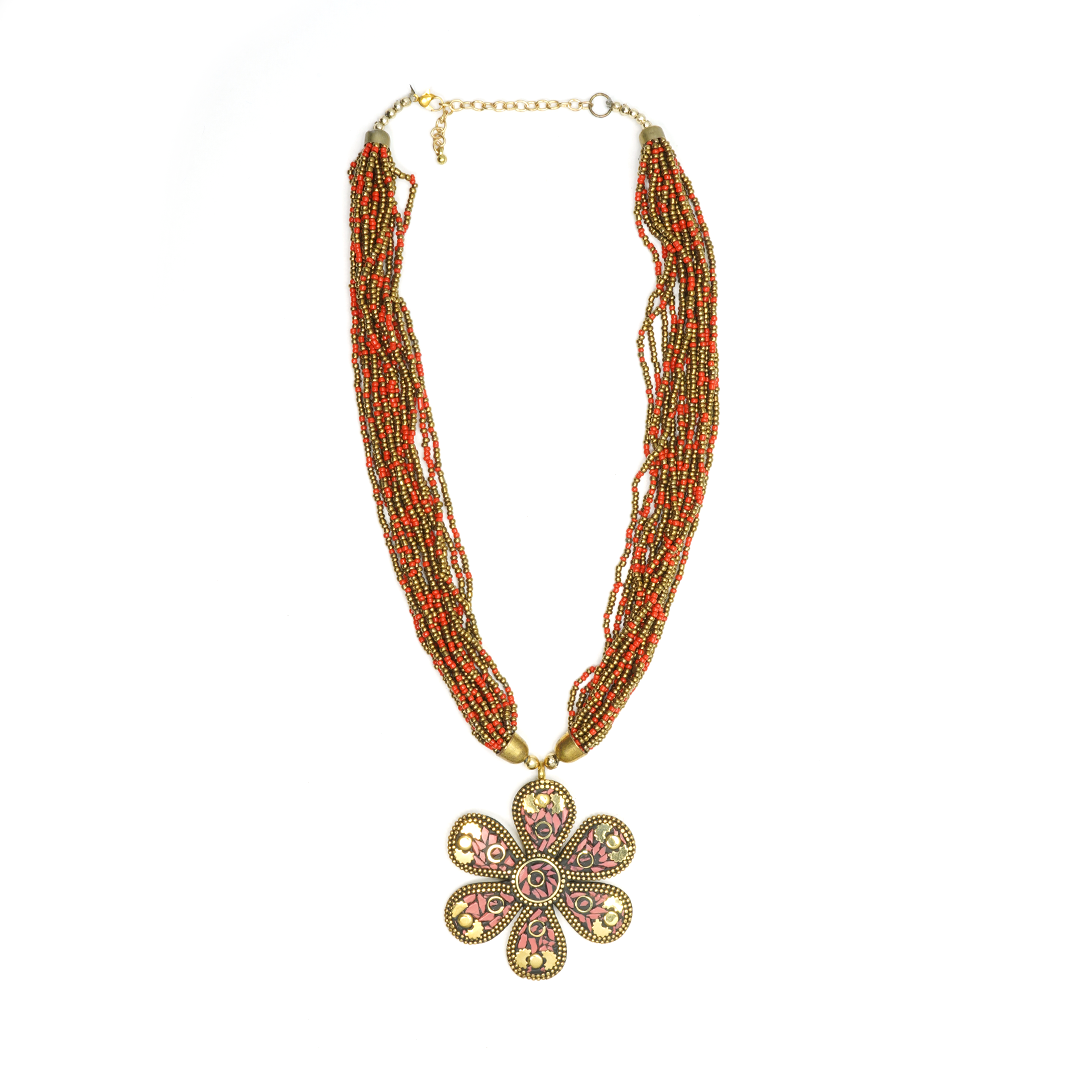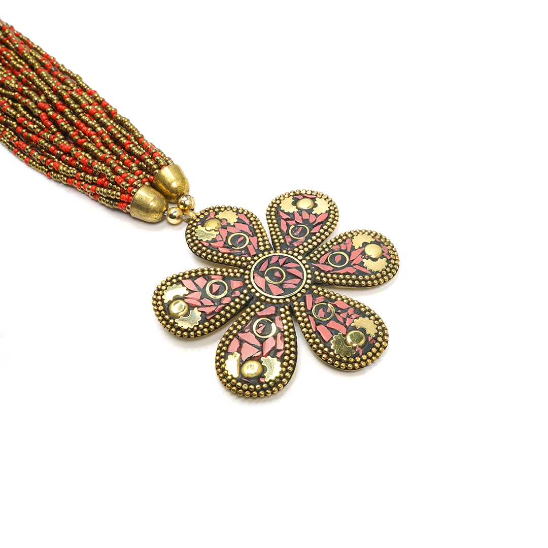 Collar de hierro con pedrería en color rojo y dorado, con dije en forma floral con pedrería traído desde la India.