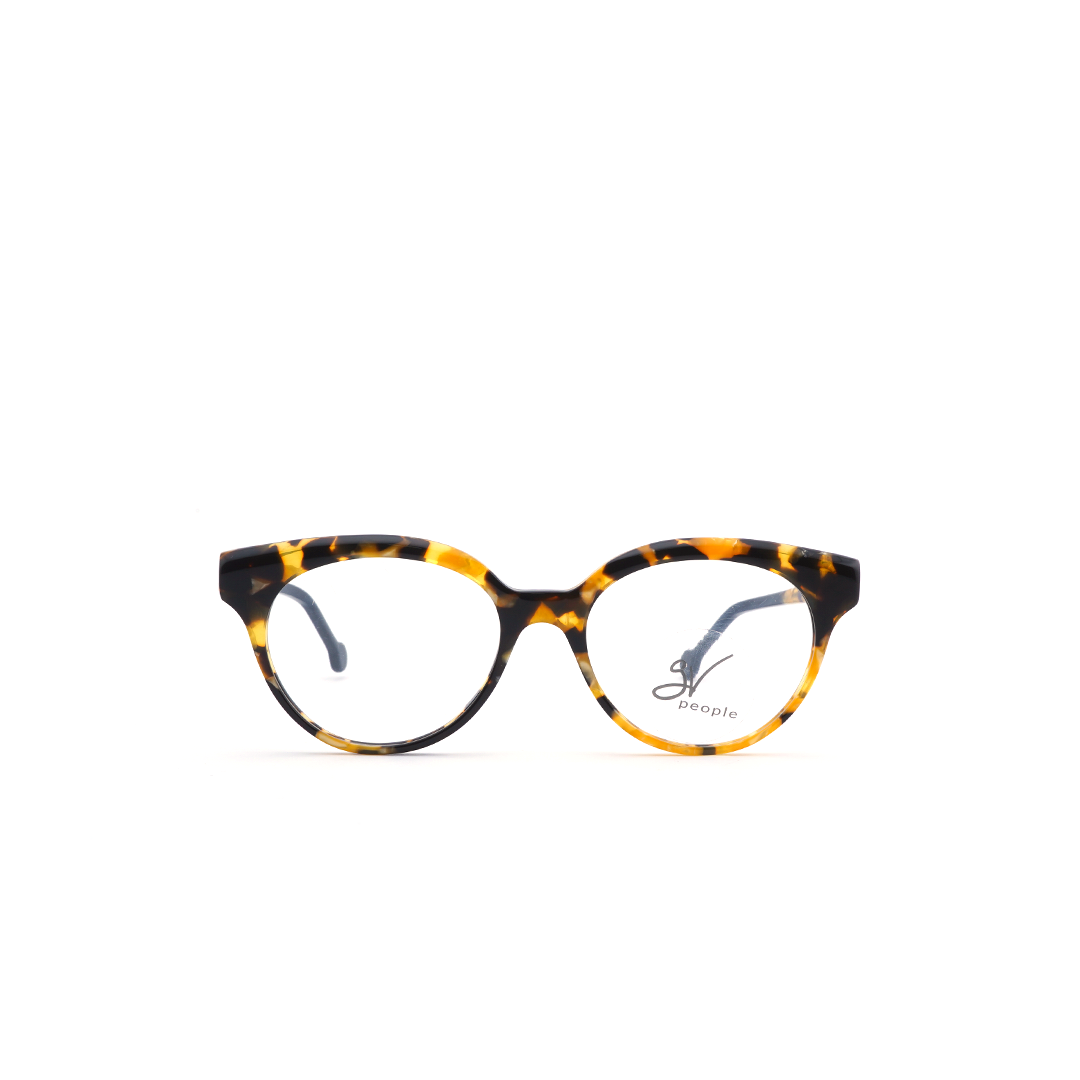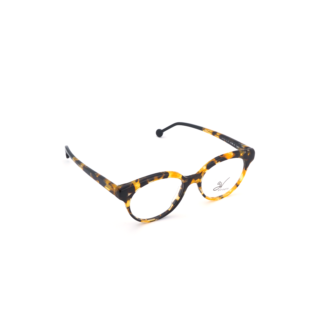 Armazón circular en tono tortoise-amarillo y negro, hecho a mano en Italia.