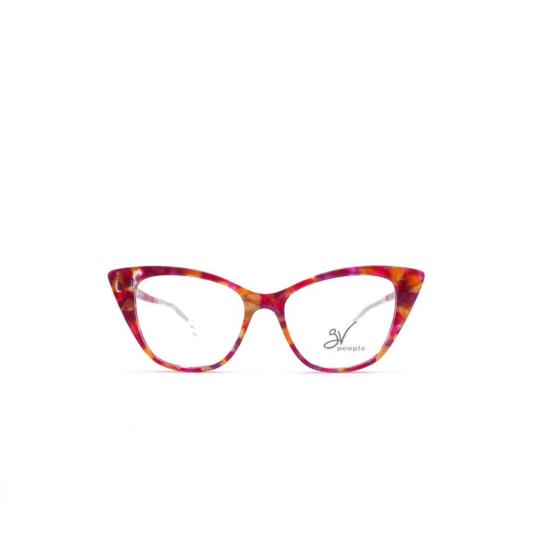 Armazón tipo “cat eye” en tonos rosa y amarillo, hecho a mano en Italia.