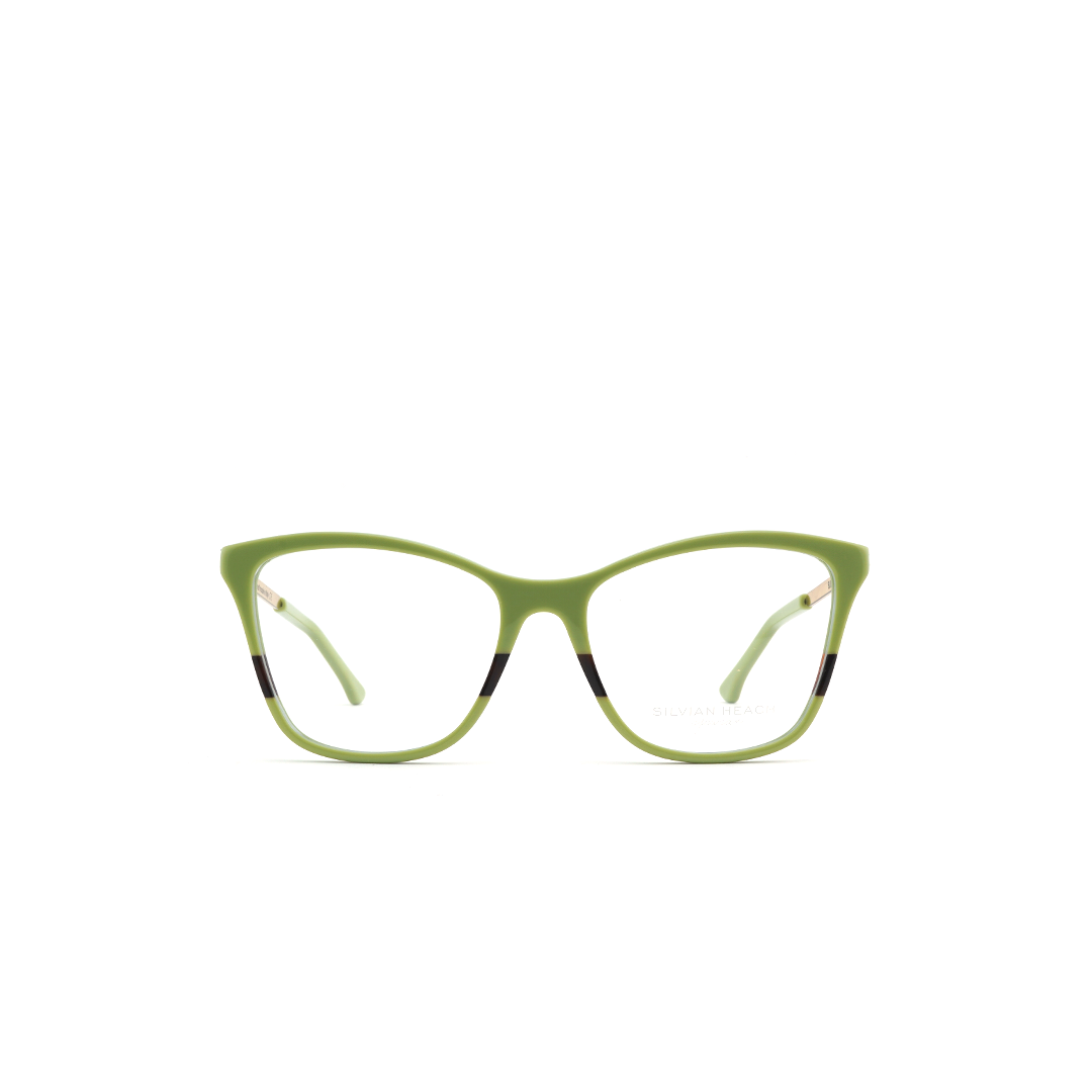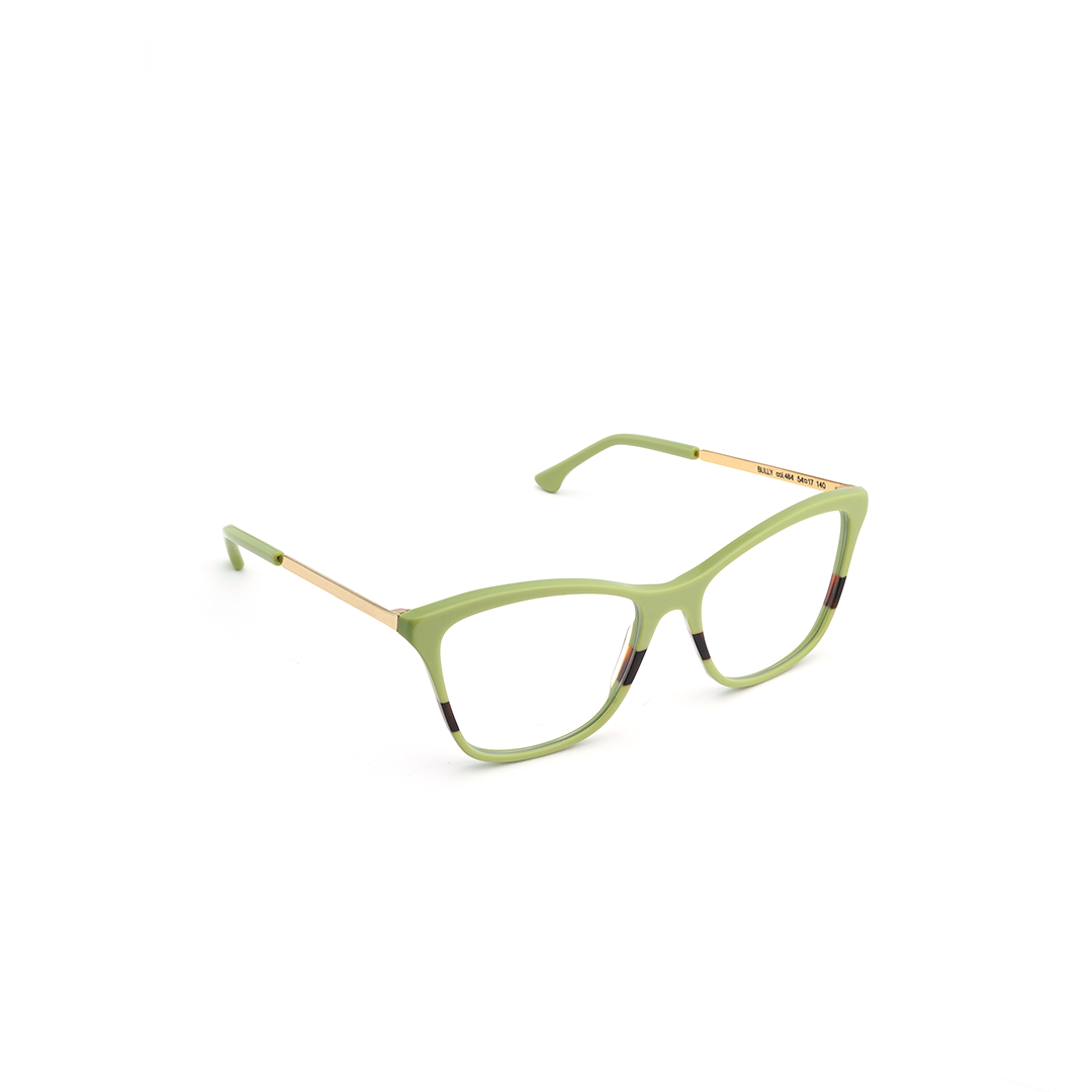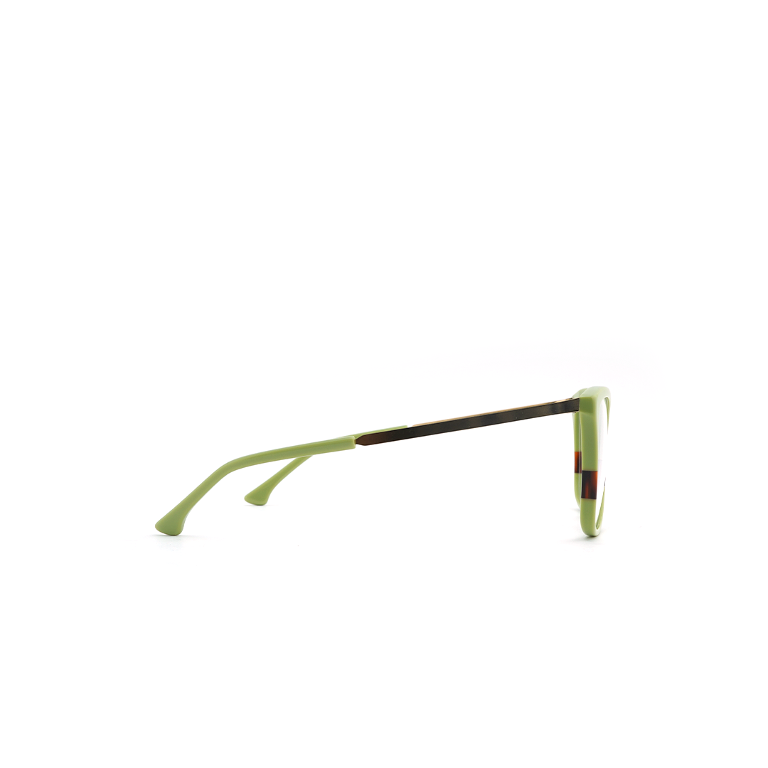 Armazón tipo “cat eye” en color verde con dorado y detalle color vino, hecho a mano en Italia.