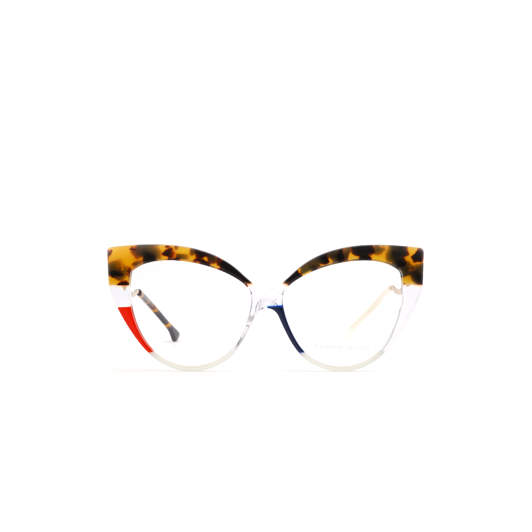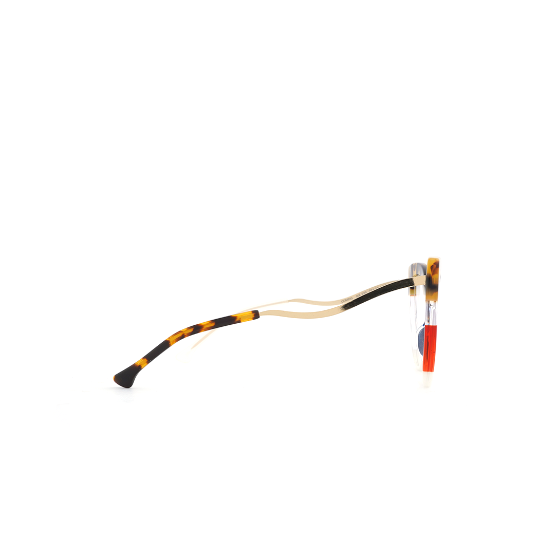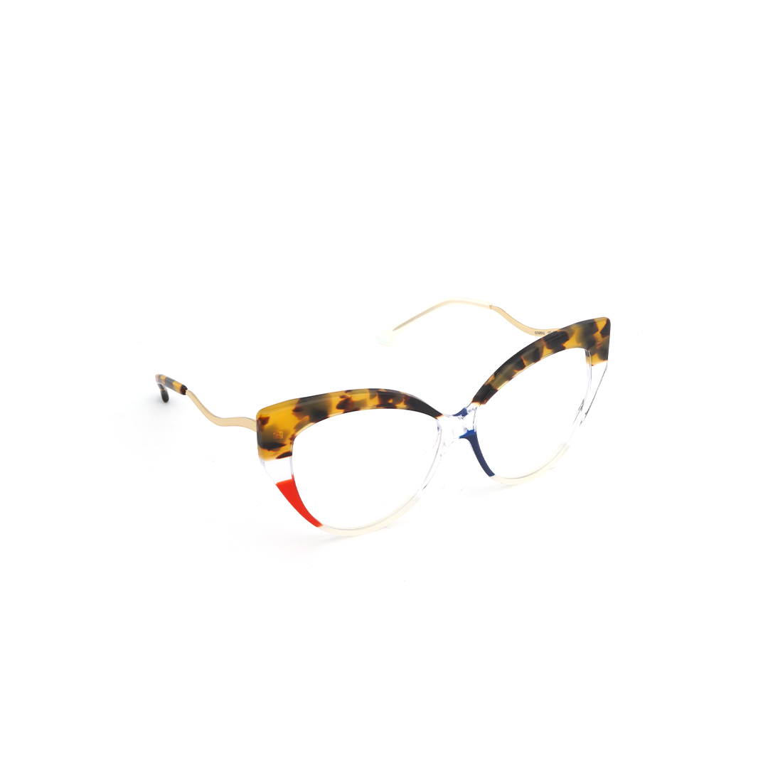 Armazón tipo “cat eye” en color tortoise-amarillo, rojo y transparente, hecho a mano en Italia.
