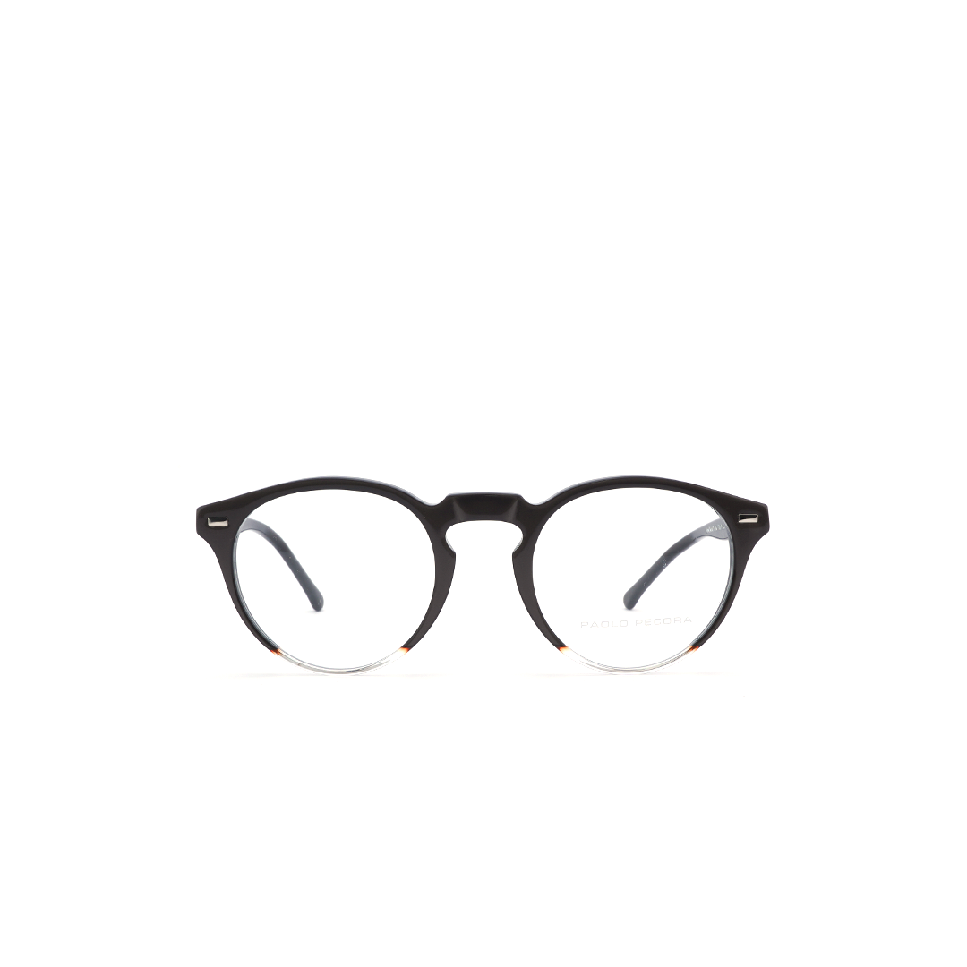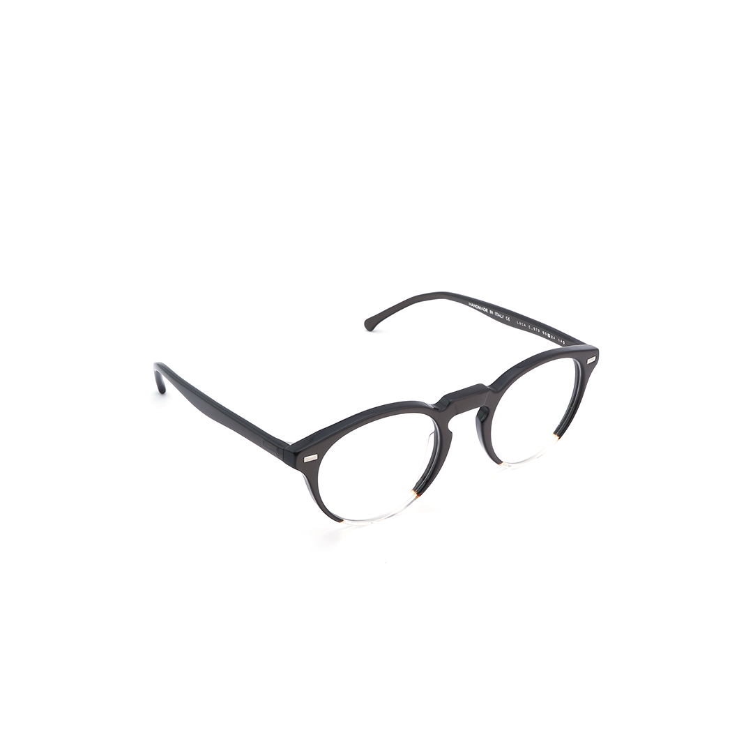 Armazón con lente circular en color negro y transparente, hecho a mano en Italia.